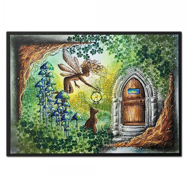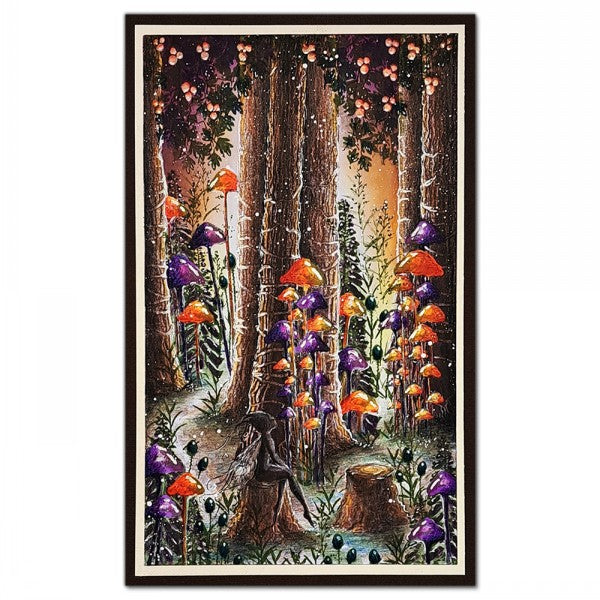 Lavinia Stamps Moss Cap Cluster Clear Stamp. This individual stamp features an illustration of a group of toadstools with long slender stalks and small pointed caps. The toadstools vary in height and cap size, making them perfect for creating patterns or adding depth to a scene. Use them as focal points or within borders to create a fairytale frame, especially when paired with the Wild Leaf Corner or near the Moss Cap set.