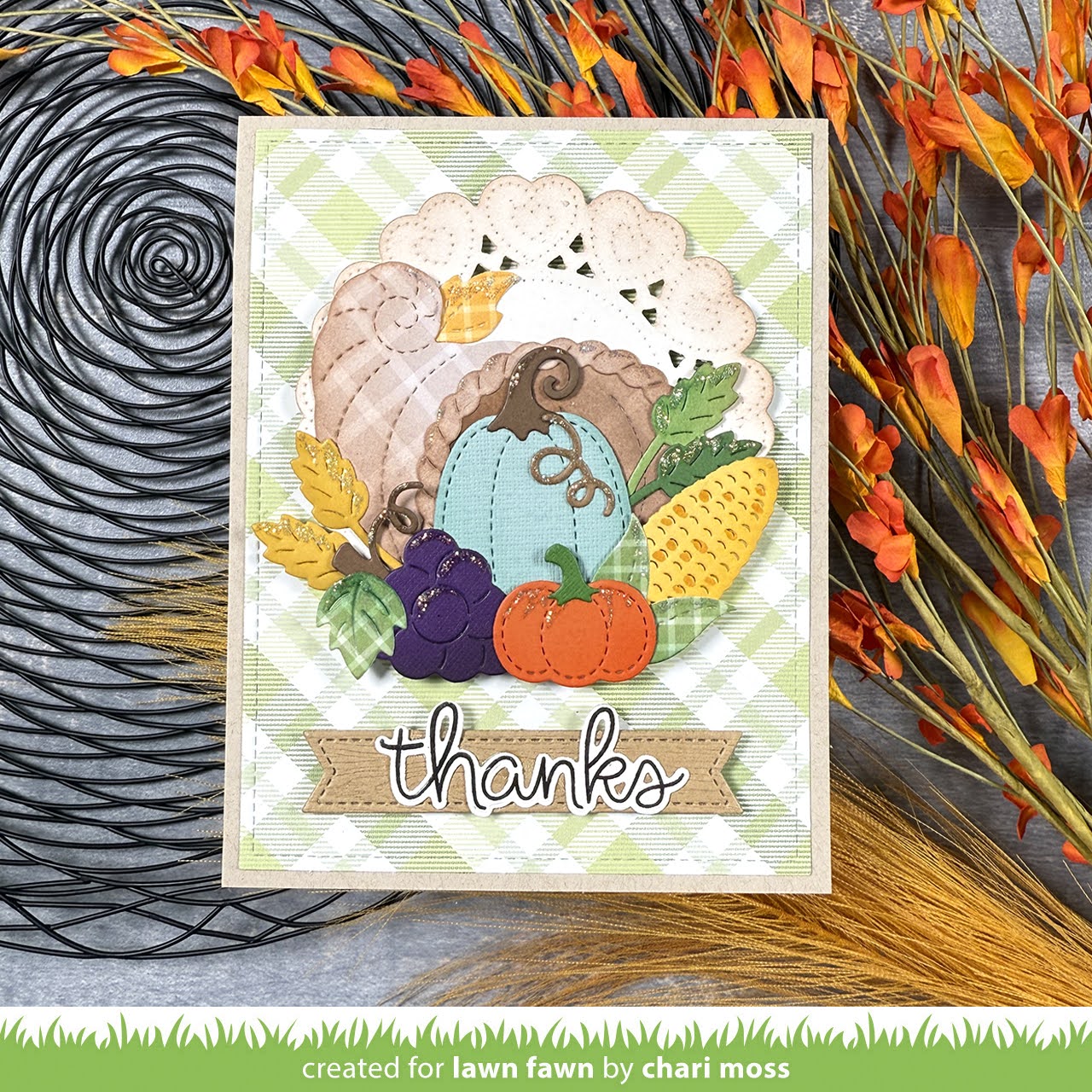 Bring smiles to your loved ones with the Lawn Fawn Cornucopia Dies! This playful set includes a cornucopia measuring 2.5 x 3 inches, bunch of grapes (1.5 x 1.75 inches), leaves, stem with vine coil, wheat grass, and a rope detail for the perfect finishing touch. Mix and match these charming elements to create festive, heartwarming projects that celebrate abundance and joy.