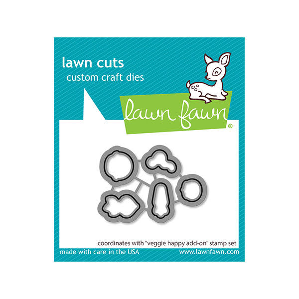 Add some extra greens to your crafts with these coordinating dies! This 5-piece die set perfectly pairs with the Lawn Fawn Veggie Happy Add-On Clear Stamps, making it easy to add some playful produce to your projects. Bring some veggie happiness to your crafting with these fun and quirky dies. Please refer to coordinating stamp set for approximate dimensions.