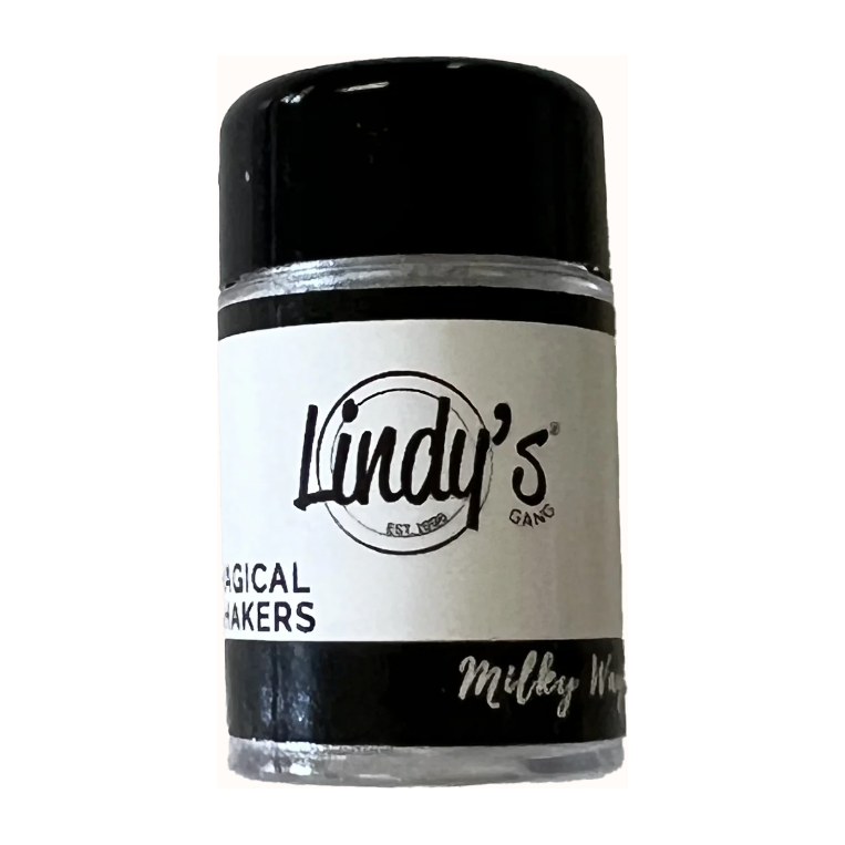 For the perfect white to brighten any project, Lindy's Stamp Gang Milky Way Magical Shaker is the ideal choice. This soft, highly pearlized white has been reformulated for increased versatility in a convenient shaker jar.