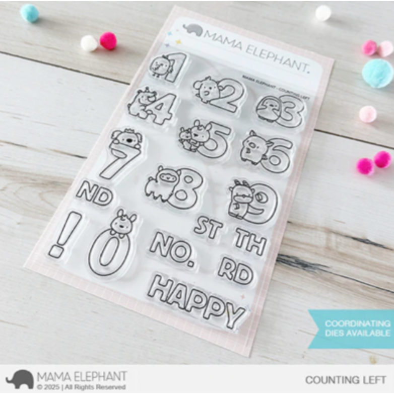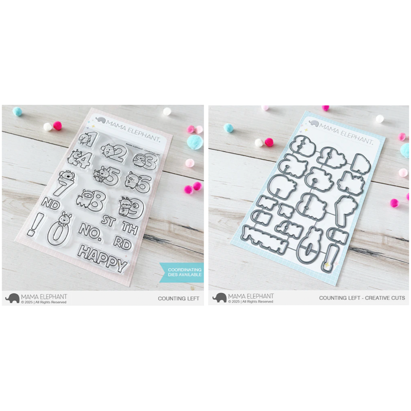 The Mama Elephant Counting Left Clear Stamp and Die Set combines a 4x6 inch clear stamp set with 17 images and a coordinating set of 17 outline dies. This versatile set includes both numbers and sentiments, making it perfect for a variety of crafting projects, from personalized cards to scrapbook layouts.