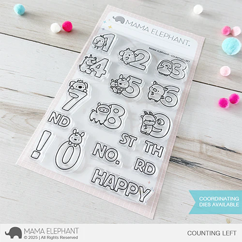 The Mama Elephant Counting Left Clear Stamps is a 4x6 inch clear stamp set featuring 17 images, including numbers and sentiments, perfect for creating versatile and creative projects. The set is designed to coordinate seamlessly with the Counting Left Creative Cuts Steel Dies, which are sold separately.