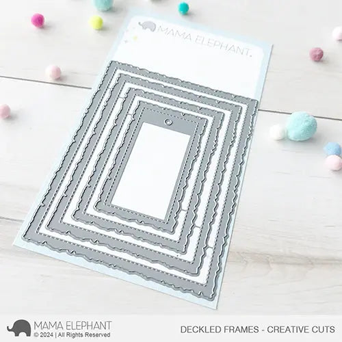 The Mama Elephant Deckled Frames Creative Cuts Steel Dies collection is a stand-alone die set featuring frames with a distinctive deckled edge design. This set includes a variety of sizes, allowing for versatile applications in crafting projects.