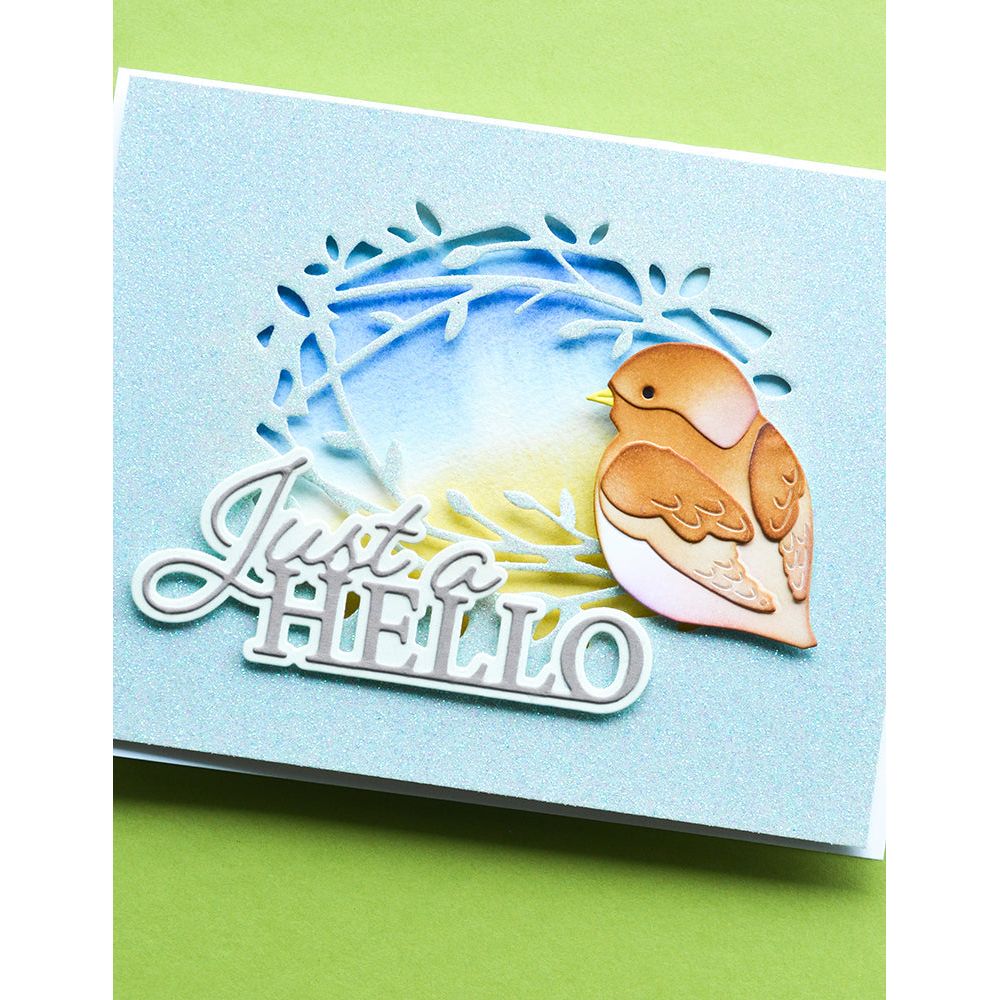 Memory Box Just a Hello Posh Script Dies are made of durable steel and usable in nearly every machine on the market! Use on cardstock, felt, fabric or shrink plastic. Cut, stencil, emboss and create! The set includes 2 dies with dimensions of approximately 3.5 x 1.4 inches and 3.6 x 1.5 inches for the outer edges. The words "Just a hello" are intricately designed in different cases and fonts, and each includes a shadow, adding depth and dimension to your projects.