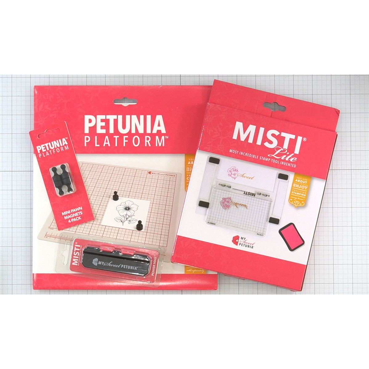 MISTI Lite – A compact, hinged stamping tool that provides consistent, accurate impressions for both beginners and seasoned crafters. It works with rubber cling mount and clear stamps—just flip the panel to the appropriate side, clearly labeled “clear” or “cling.” Use it on its own or pair with the included Power Mag and Petunia Platform for an extra-secure cardstock hold. Tool size: approximately 5.3 x 6.7 inches; stamping area: about 5.75 x 3.375 inches.