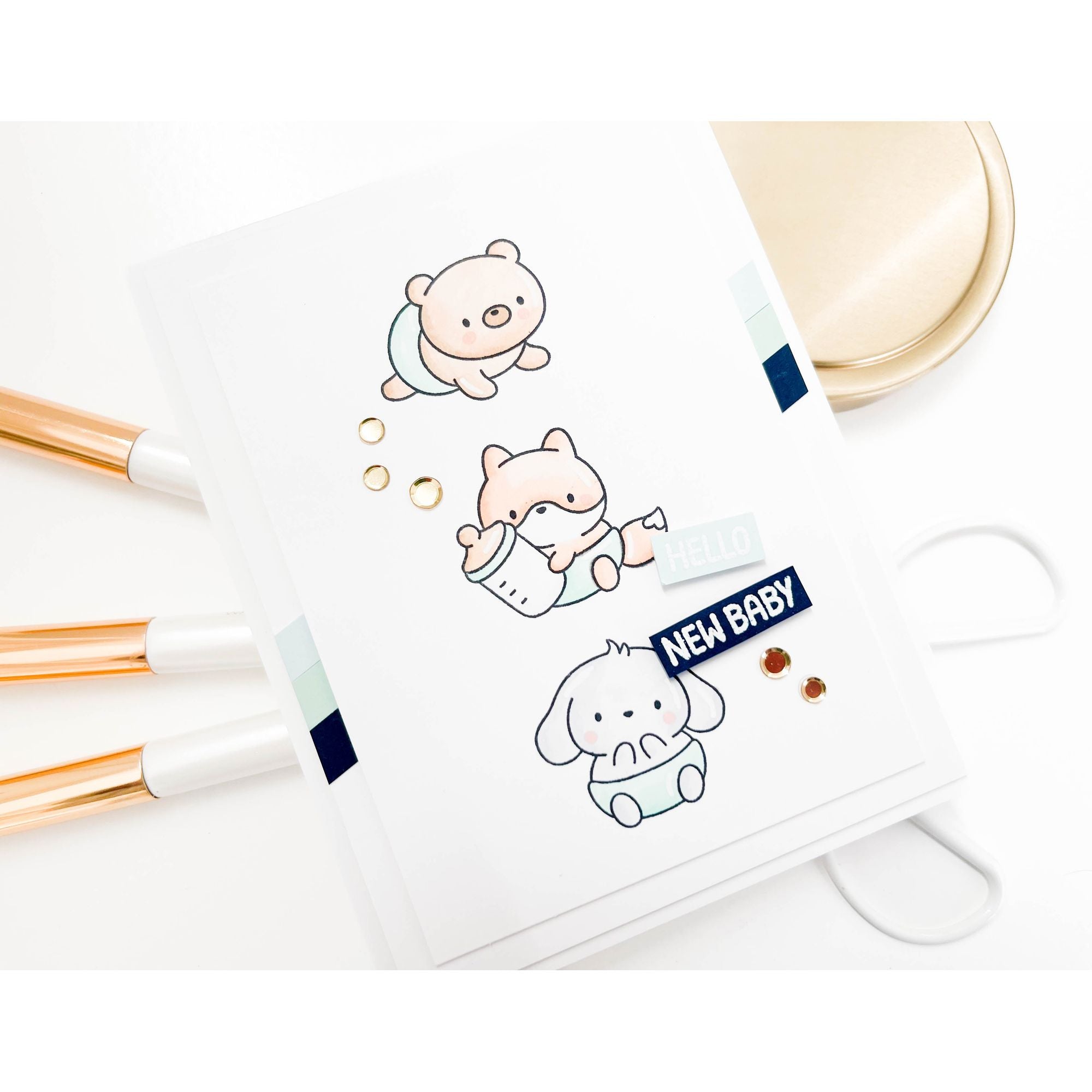 The Simon Says Stamp Welcome Little One stamp and die set features an endearing collection of baby animals, each full of charm and personality. Included are a bear, mouse, bunny, raccoon, fox, and puppy—each one holding a different baby item, such as a block, bottle, rattle, or snuggling a cozy blanket. One animal is even crawling, adding an extra touch of sweetness.