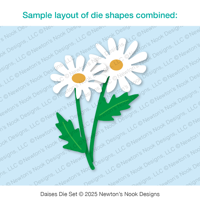 Enhance your spring cards with Newton's Nook Designs Daisies Dies. This versatile set includes charming daisies, a stem, and a leaf that can be used individually as single flowers, assembled to create a beautiful bouquet, or employed as delightful accents on stamped images. The creative possibilities are endless! Compatible with most die-cutting machines, this die set comprises six dies with approximate sizes as follows: