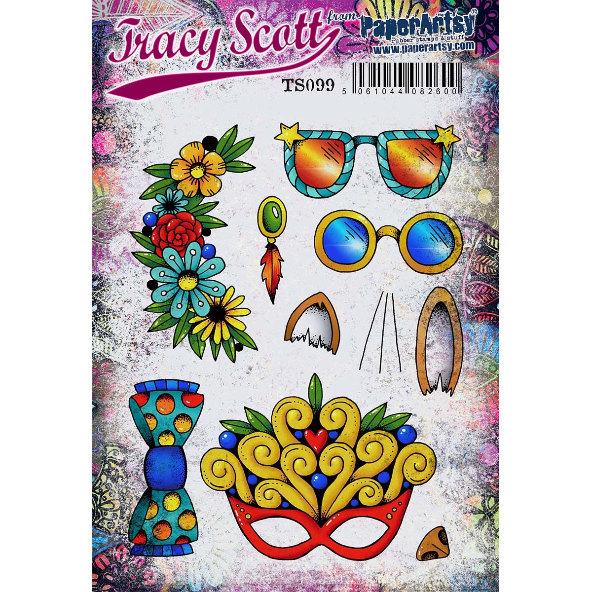 Paper Artsy Tracy Scott Cling Stamps capture Tracy’s signature bright and cheerful style, featuring playful doodles and bold imagery. Perfect for journaling, card making, scrapbooking, and mixed media projects, this versatile 6 x 8-inch cling stamp set includes 10 deeply etched red rubber stamps. This set features a fun assortment of accessory-themed designs, including quirky sunglasses and round glasses, an ornate masquerade mask, a polka dot bowtie, animal ears, a nose with whiskers, a feathered brooch, and a detailed floral headpiece—perfect for adding personality, character, and flair to your creative makes.