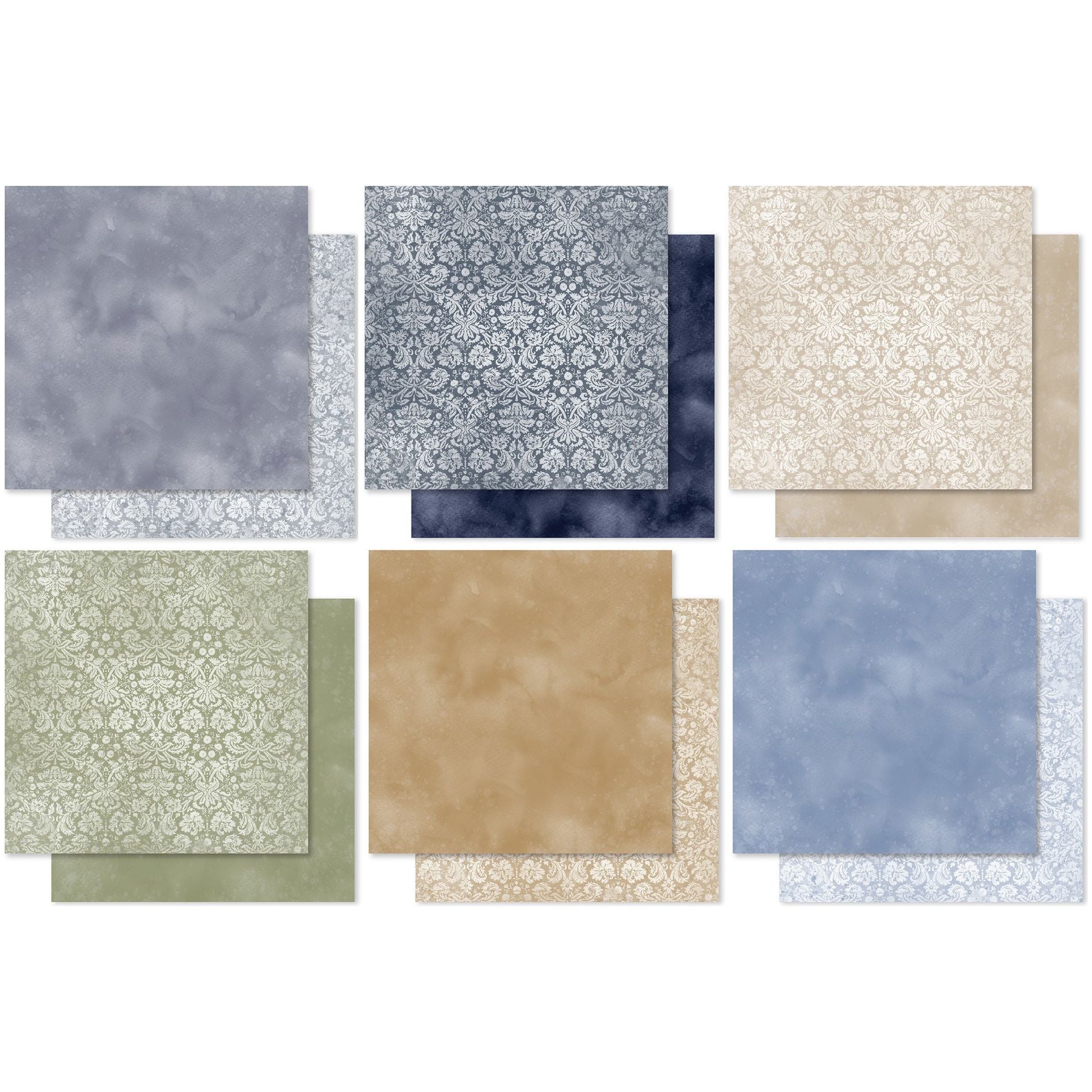 The Paper Rose Wedding Blooms Textures 12x12 Paper features 12 double-sided sheets, each measuring approximately 12 x 12 inches and boasting a sturdy weight of 200gsm. Inside the pack, you'll find 2 sheets of each of the 12 designs, offering a variety of options for your projects. The paper showcases an array of charming textures, including washed backgrounds and elegant damask prints in sophisticated hues such as tan, smokey gray, dark blue, brown, green, and light blue.