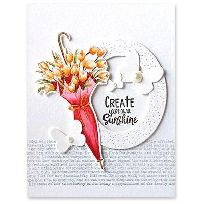 This delightful 5 x 6.5 inch clear stamp set features four charming spring-themed stamps. The first stamp showcases a vase full of tulips, radiating the freshness and beauty of spring blooms. The second stamp depicts an umbrella filled with tulips, adding a whimsical touch to your creations. The third stamp features a simple bouquet of wildflowers, capturing the essence of nature's beauty. The fourth stamp showcases a serene floral scene with a birdhouse, eggs, and potted plants, evoking the joy and renewal of springtime.