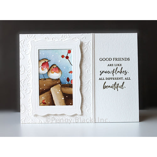 The Penny Black Resting Cling Stamp features a delightful image of two little birds perched on the bottom of an upside-down clay pot, accompanied by two other clay pots, one with a small plant growing from it. This charming stamp measures approximately 4.62 x 3.38 inches and is perfect for adding a touch of nature to your projects.