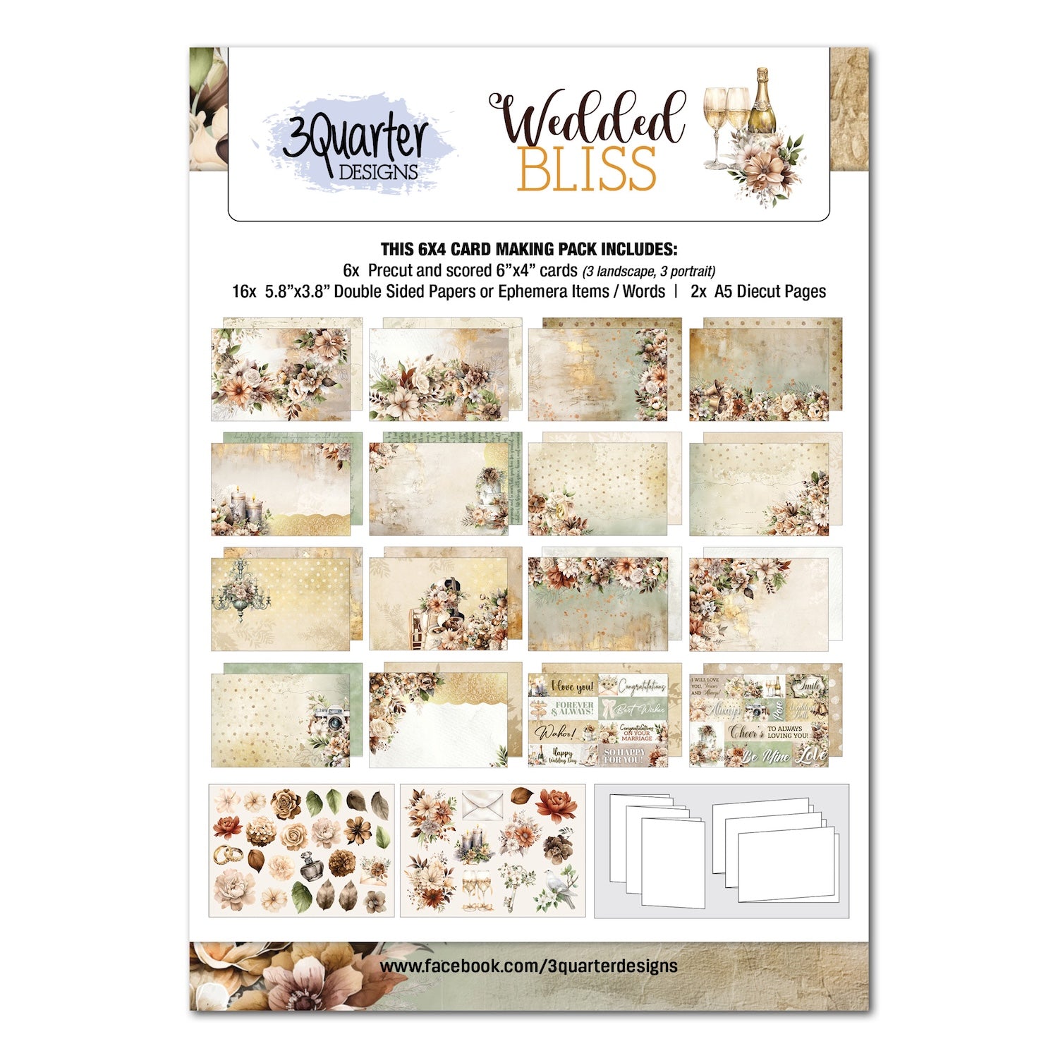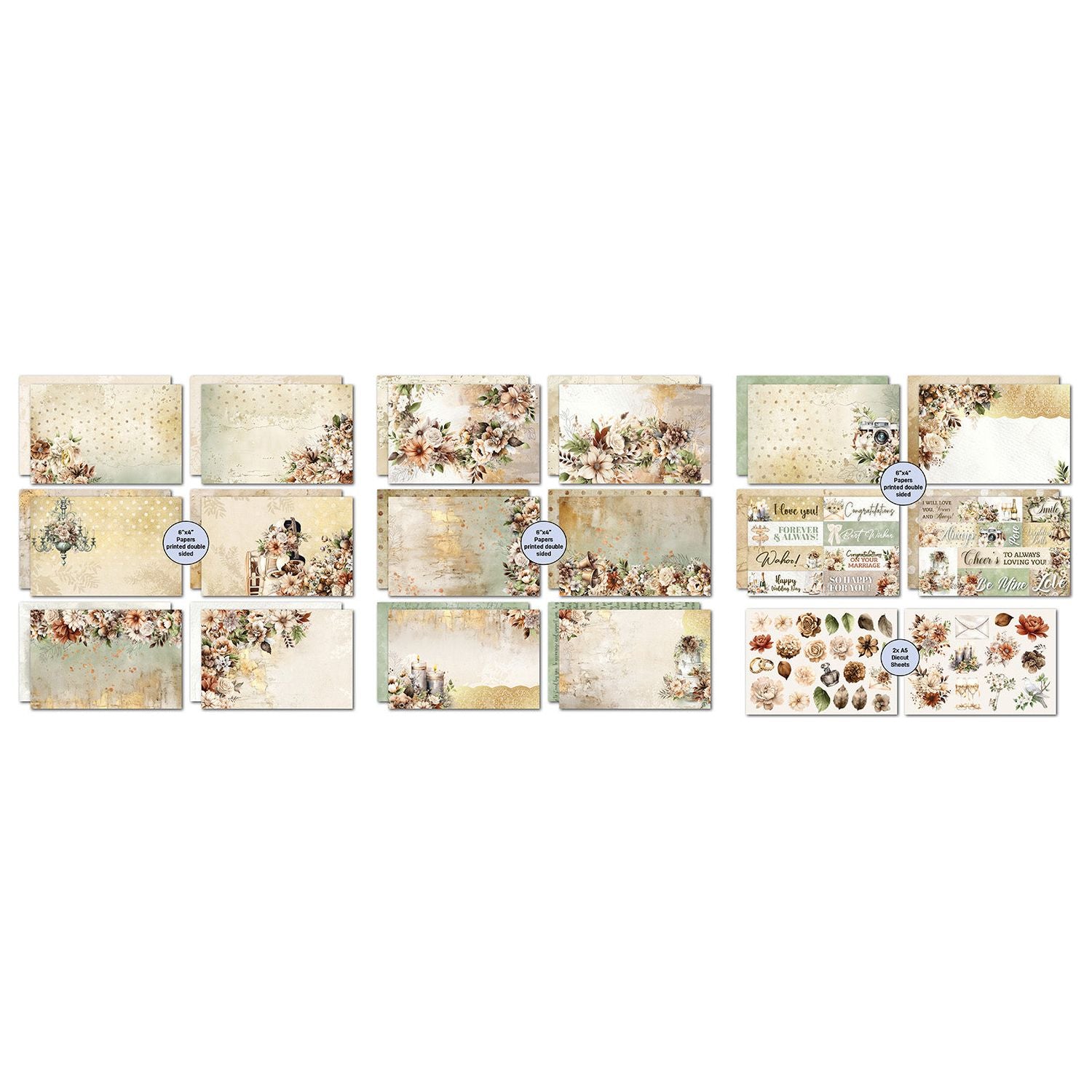 Experience elegance with 3Quarter Designs Wedded Bliss 6x4 Card Pack. Featuring a soft, romantic color palette of cream and green with hints of gold accents, this collection adds a touch of glamour to wedding-themed projects. With delicate florals, wedding bells, a cake, charming candles, and vintage details like a classic car and camera, this set beautifully captures the essence of love and celebration. Included are heartfelt quotes such as "I love you," "Congratulations," "So happy for you," "Best wishes," and more, along with ephemera elements to enhance your designs.
