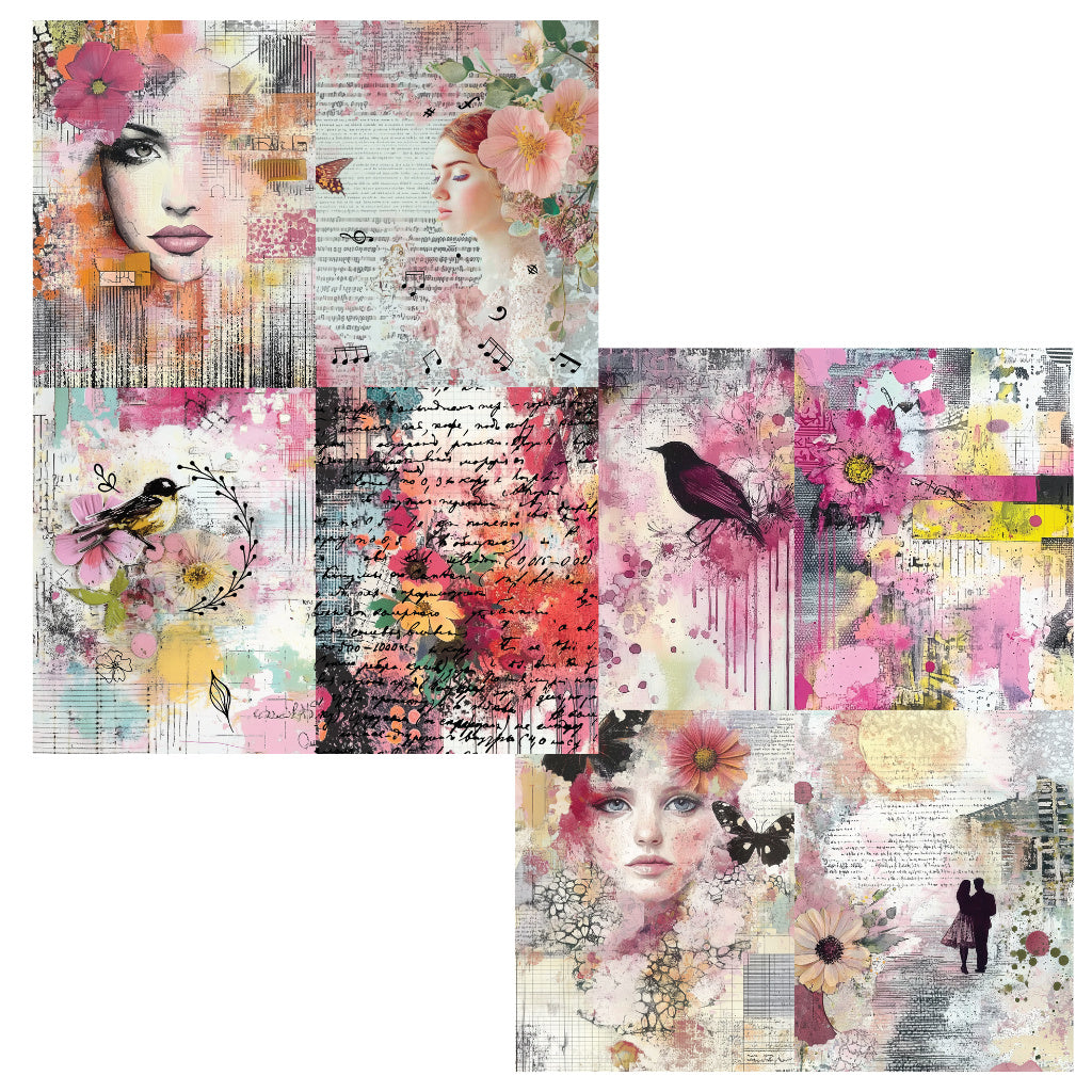 Brutus Monroe Art Journal 1 DuoFoil Sheets are filled with floral beauty and artistic detail. These DuoFoil Sheets feature a colored card base with a black design overlay that can be hot foiled using a Minc, Fuse, or laminator. Each 8.5 x 11-inch sheet showcases collage-style designs featuring flowers, watercolor effects, birds, faces, musical notes, script writing, and textured backgroundsāperfect for adding rich, shimmering layers to art journals, cards, scrapbook pages, and mixed media creations.