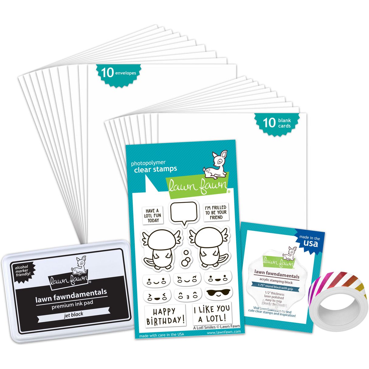 Introduce your child to the magical world of cardmaking with this Lawn Fawn A Lotl Smiles Kids Cardmaking Kit! Perfect for ages 8 and up, this kit includes everything they need to create 10 handmade cards, including the A Lotl Smiles 3x4 inch clear stamp set, a round 1.75 inch stamping block, Lawn Fawn's jet black premium ink pad, Diagonal Rainbow Stripes foiled washi tape, as well as 10 A2 white blank cards and 10 A2 white envelopes. Adult supervision recommended for a fun and whimsical cardmaking adventure!