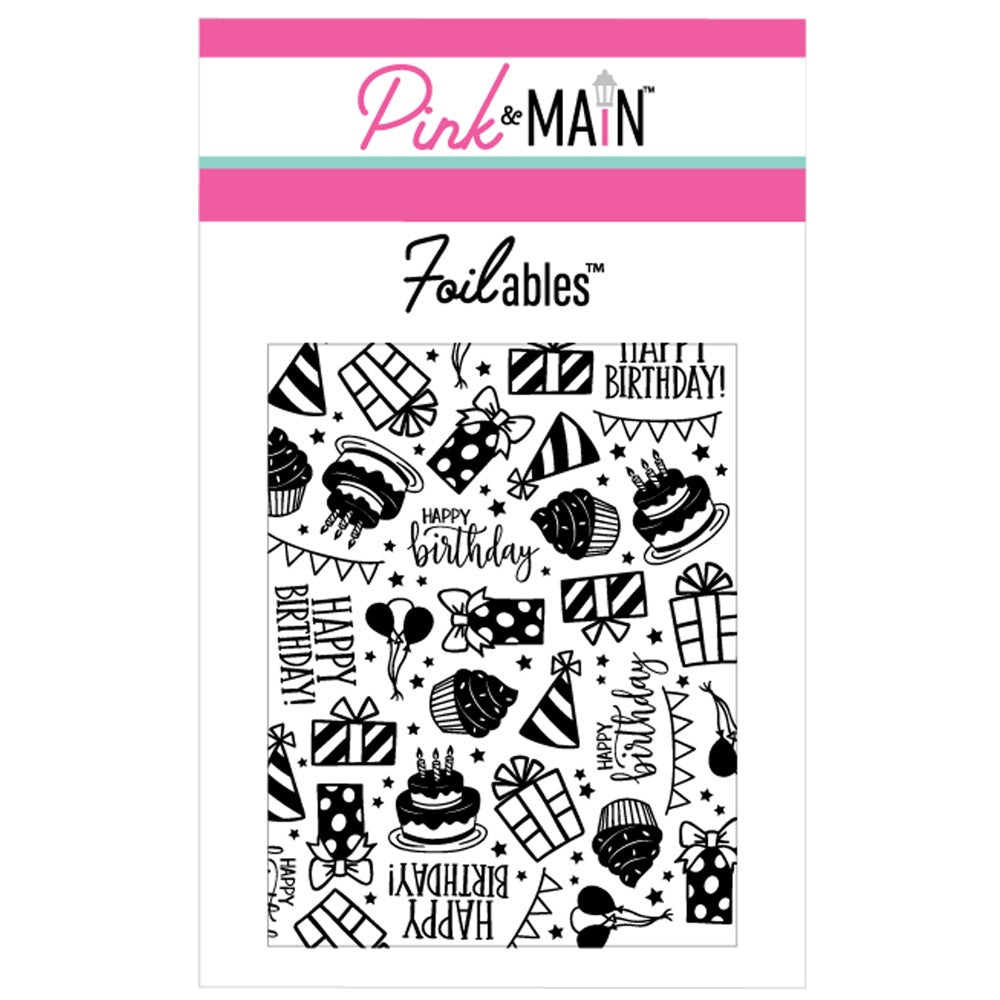 Create stunning foiled designs for birthdays with Pink and Main's A2 sized Foilables, measuring 4 x 5.25 inches. This set includes 8 sheets of birthday-themed images, ready to be foiled with CheerFoils and a Minc Machine for a beautiful finished look.