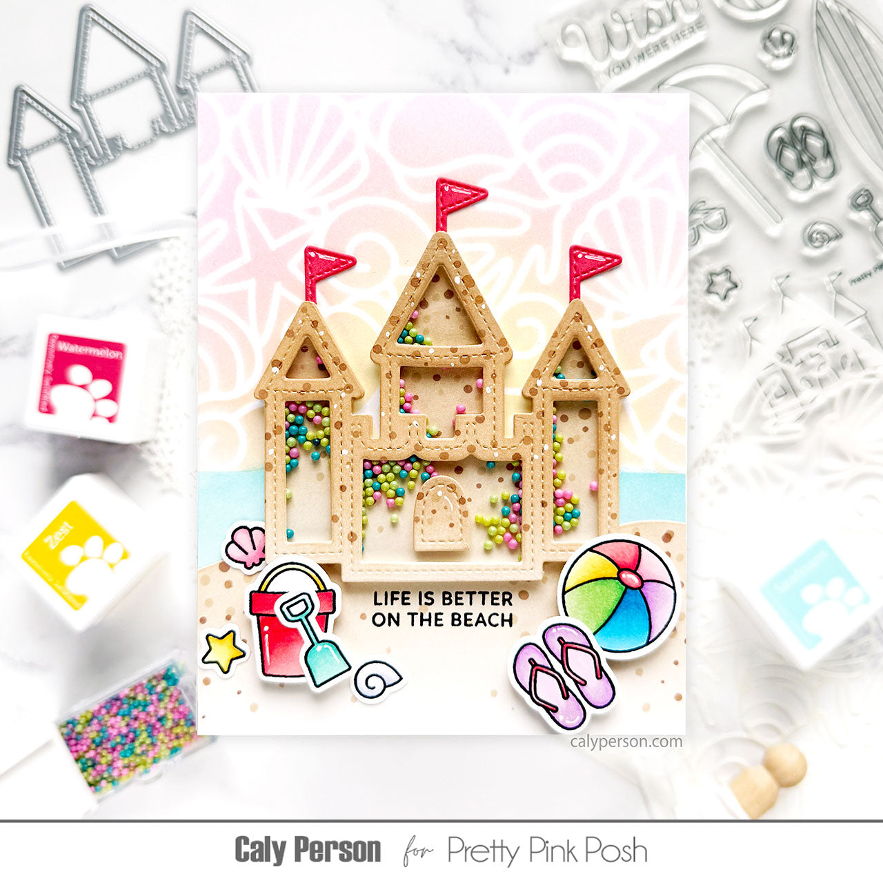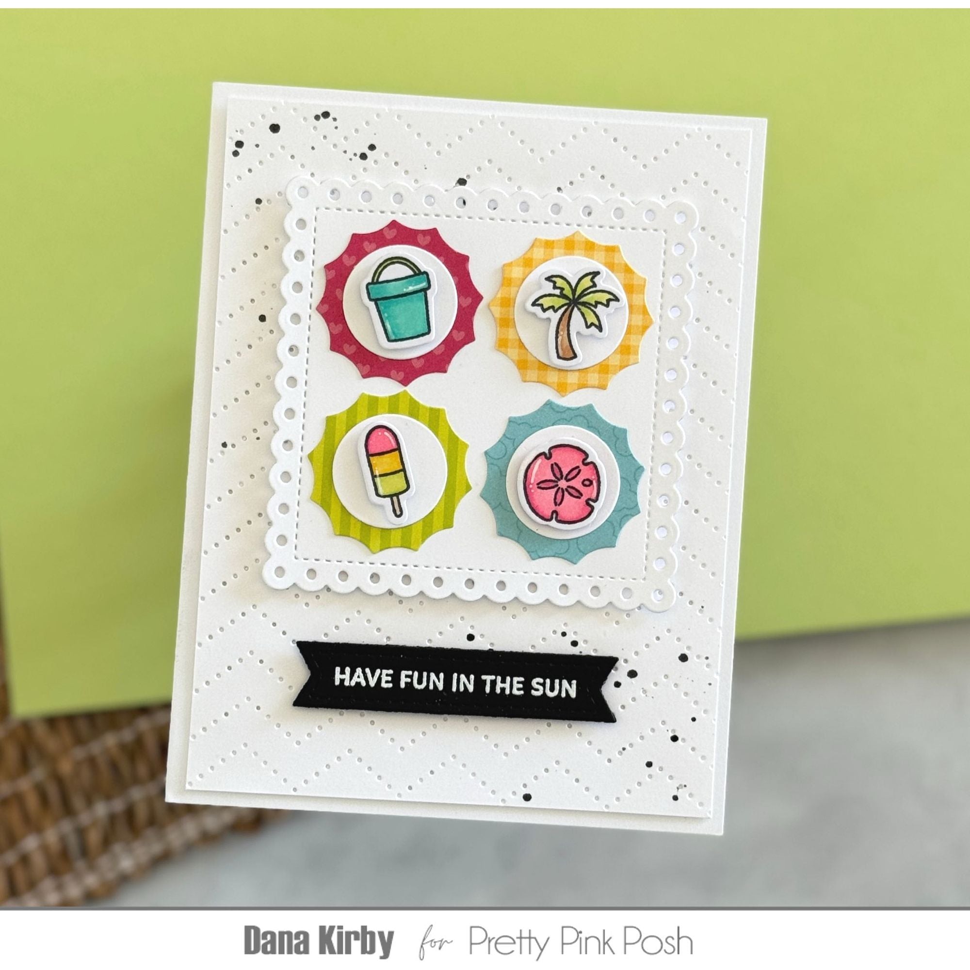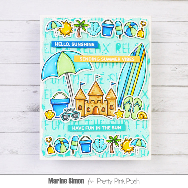 The Pretty Pink Posh Summer Icons Clear Stamps is a 3 x 4 inch clear stamp set featuring 12 classic summer-themed images. Designs include a sunshine, palm tree, bucket, shovel, seashell, beach ball, sunglasses, starfish, and more, perfect for capturing the fun of summer in your craft projects. Coordinating Summer Icons Dies sold separately.