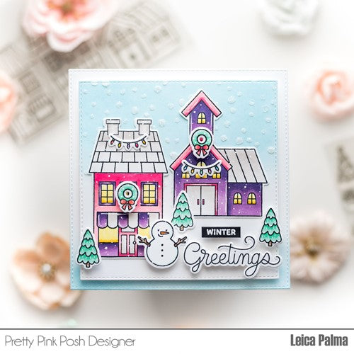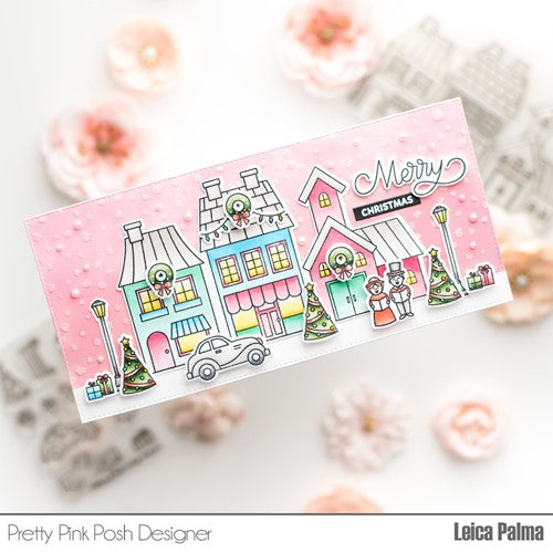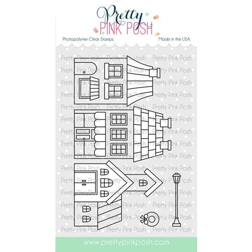 Create whimsical and fun creations with this 4 x 6 inch stamp set. Includes 3 designs. Village is approximately 3.125 x 5.312 inches, it does NOT fit on a standard A2 size card. Made in the USA