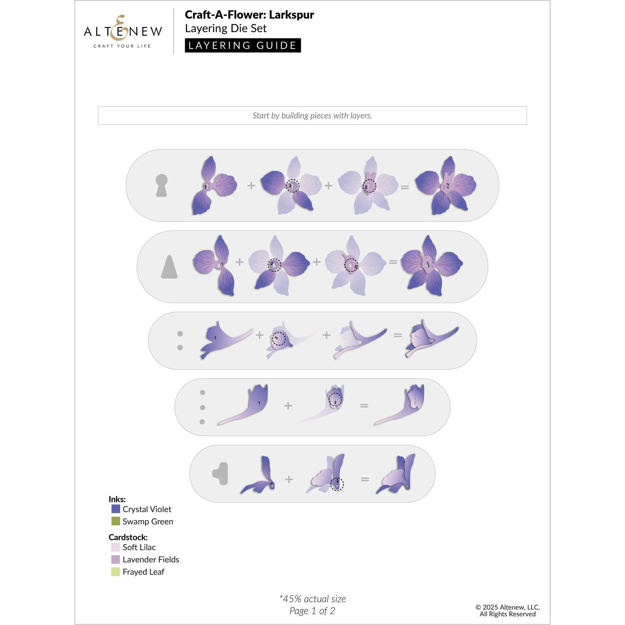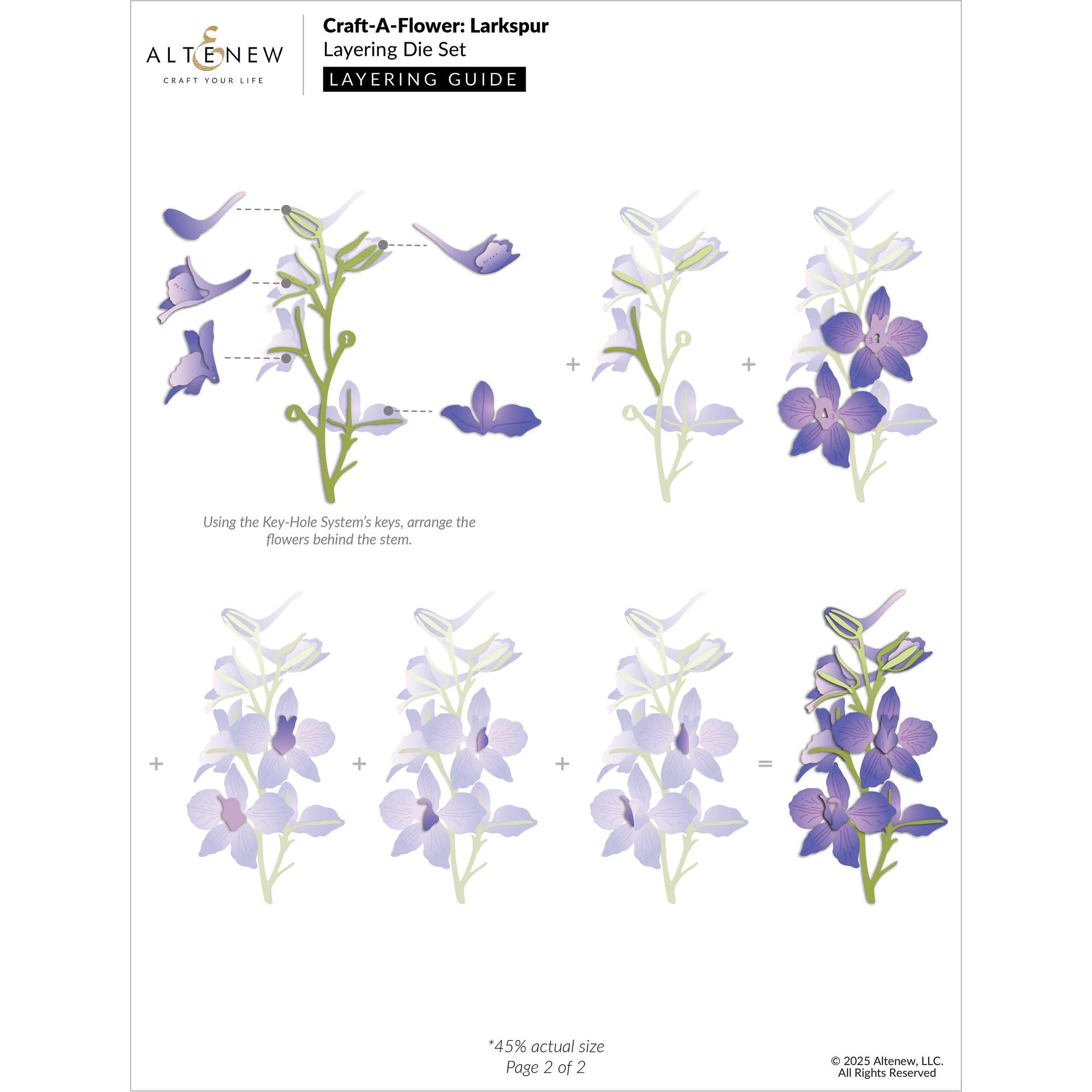 This beautifully detailed die set includes everything you need to create two full-bloom larkspurs, buds, and blossoms using Altenew’s Key-Hole System for effortless alignment and layering. Mix and match your favorite colors to build lifelike floral arrangements that bring elegance to cards, scrapbook pages, and more. Includes 10 dies, compatible with most leading die cutting machines.