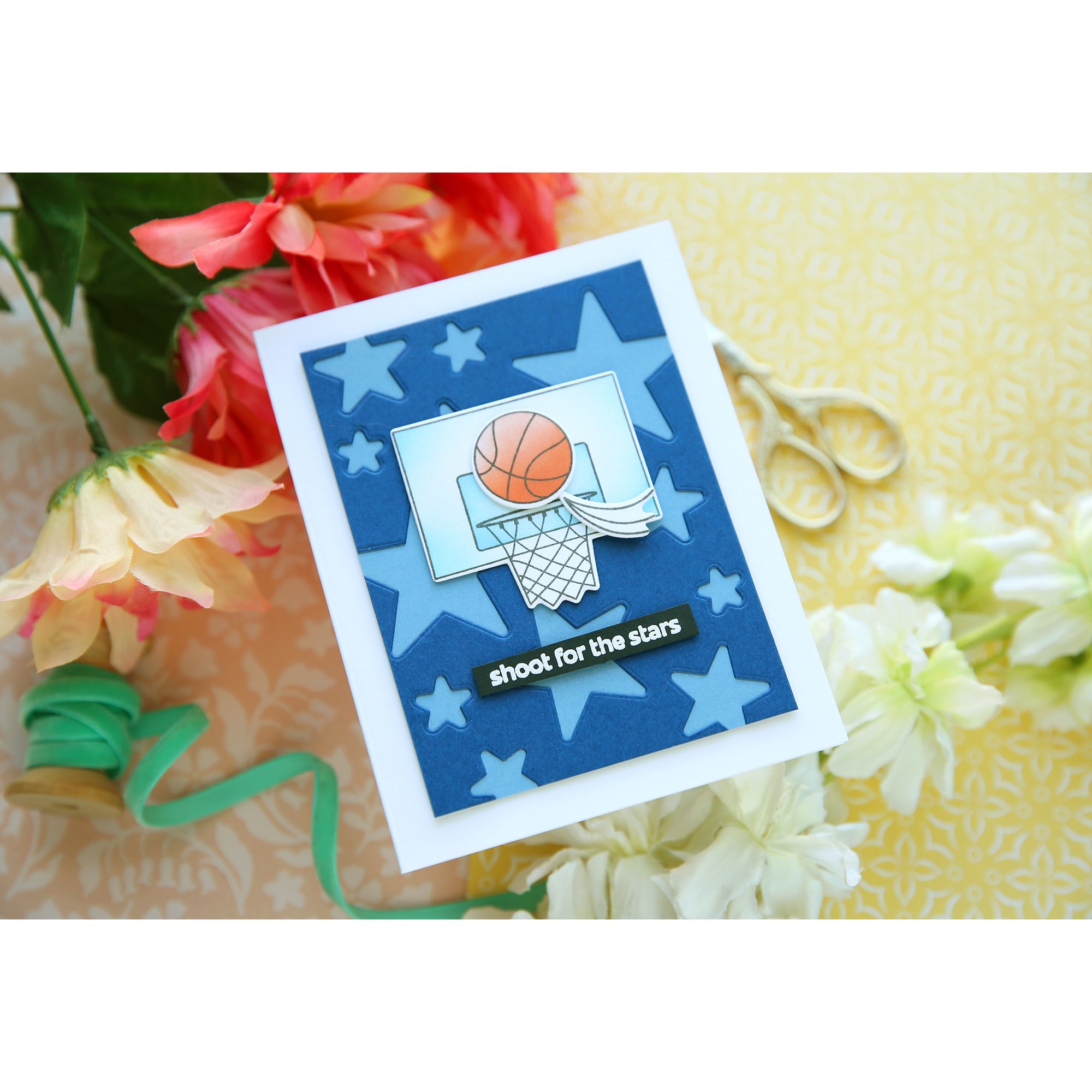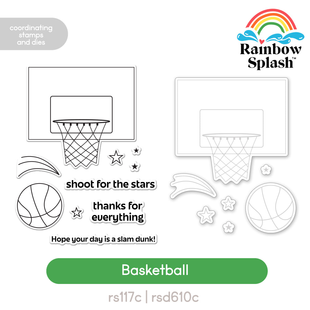 The Rainbow Splash Basketball stamps and dies set brings bold energy and playful style to your projects. This sporty collection features classic basketball imagery, including a ball, net with backboard, stars, and a dynamic motion "swoosh" to capture the excitement of the game.