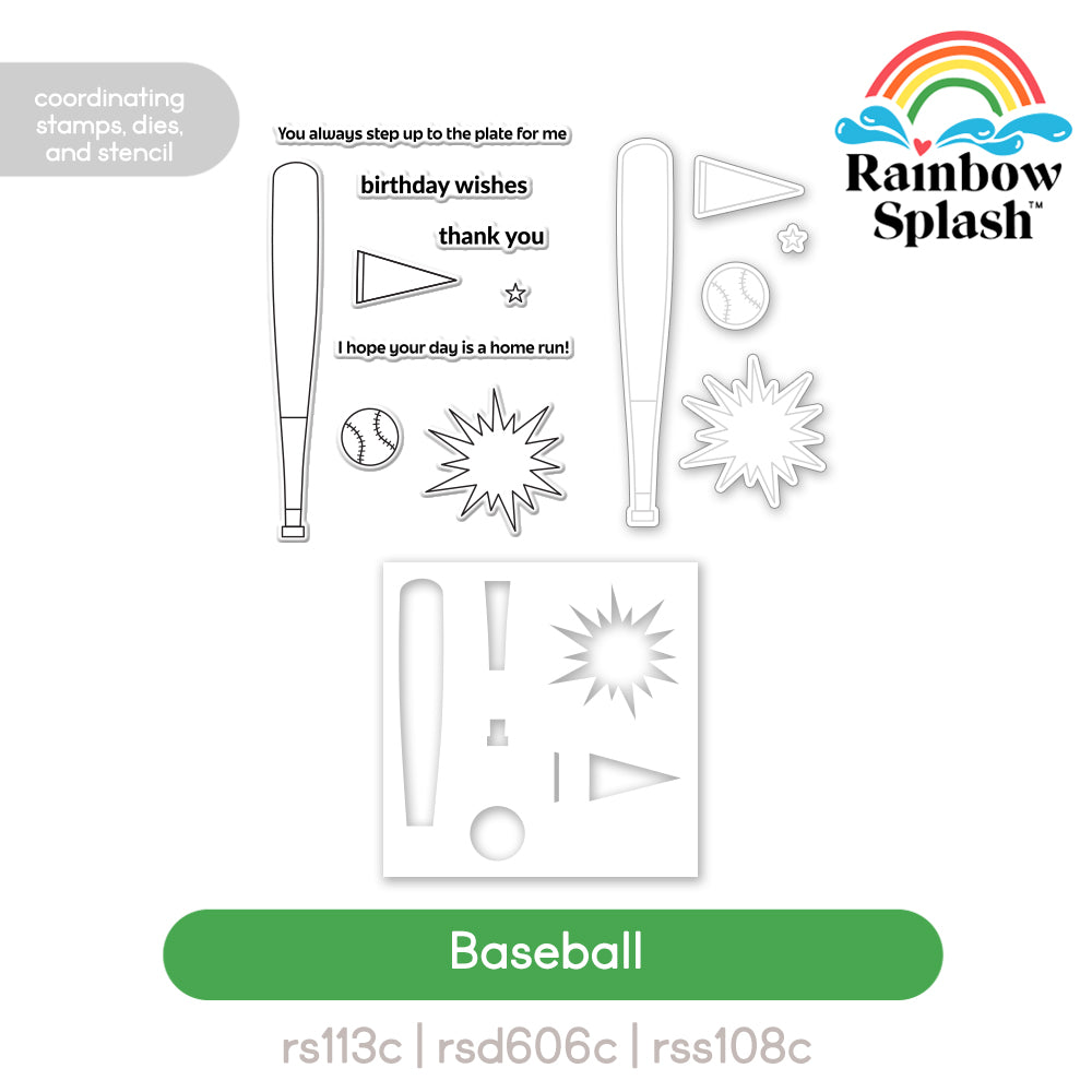 The Rainbow Splash Baseball stamp, dies, and stencil set knocks it out of the park with sporty style and bold imagery. This playful collection features classic baseball icons, including a bat, ball, pennant, and a dynamic "pow"-style burst for adding energy to your projects.