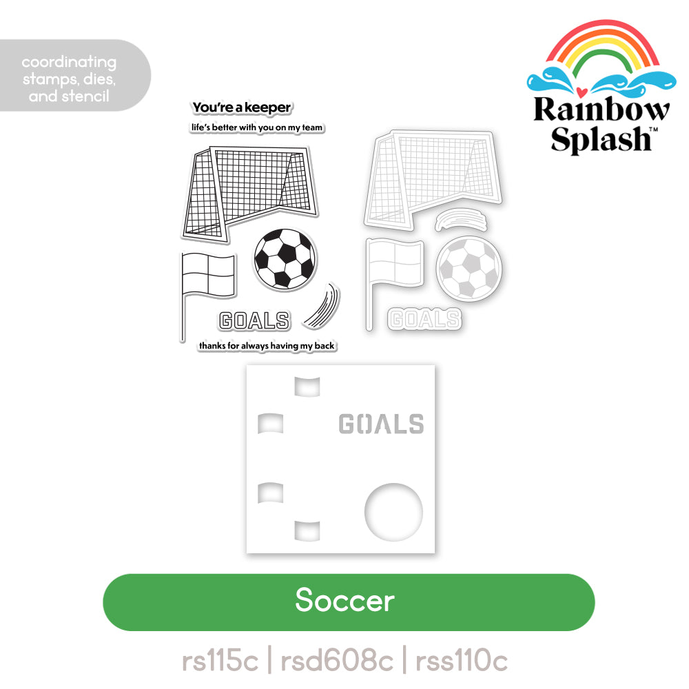 Dies cut out the four images and the "GOALS" sentiment, and the stencils allow you to add color to them. Ideal for cards, scrapbook layouts, or party décor, the Rainbow Splash Soccer bundle is a winning choice for fans and players alike. Rainbow Splash products are available exclusively from Simon Says Stamp.