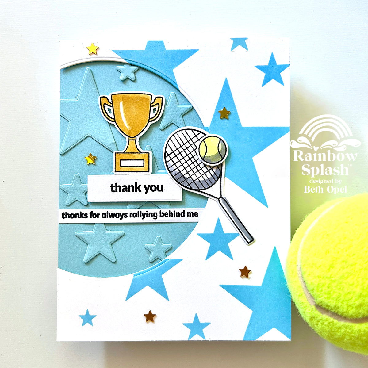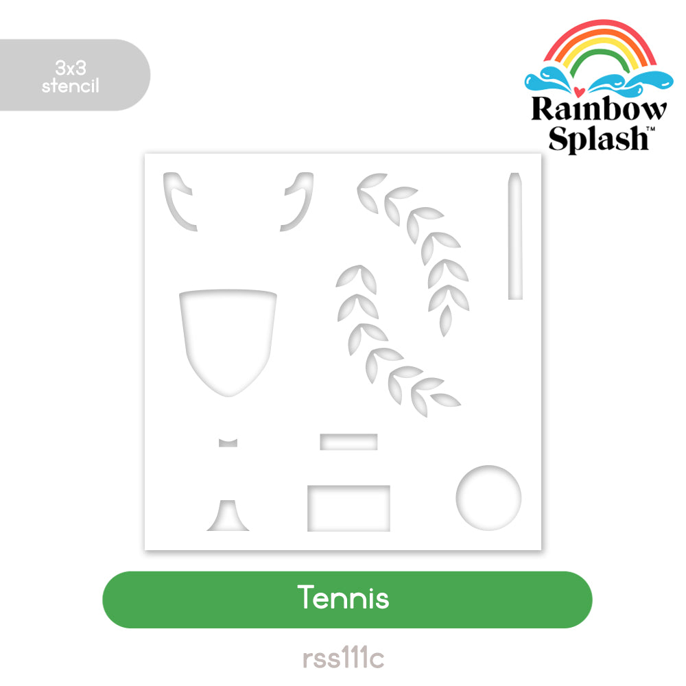 The Rainbow Splash Tennis stencil is designed to make adding color to your sporty projects fast and easy. Created to coordinate with the Rainbow Splash Tennis stamp set, this stencil lines up with the racquet, ball, trophy, and laurel branches so you can quickly ink, blend, or add texture without intricate coloring.