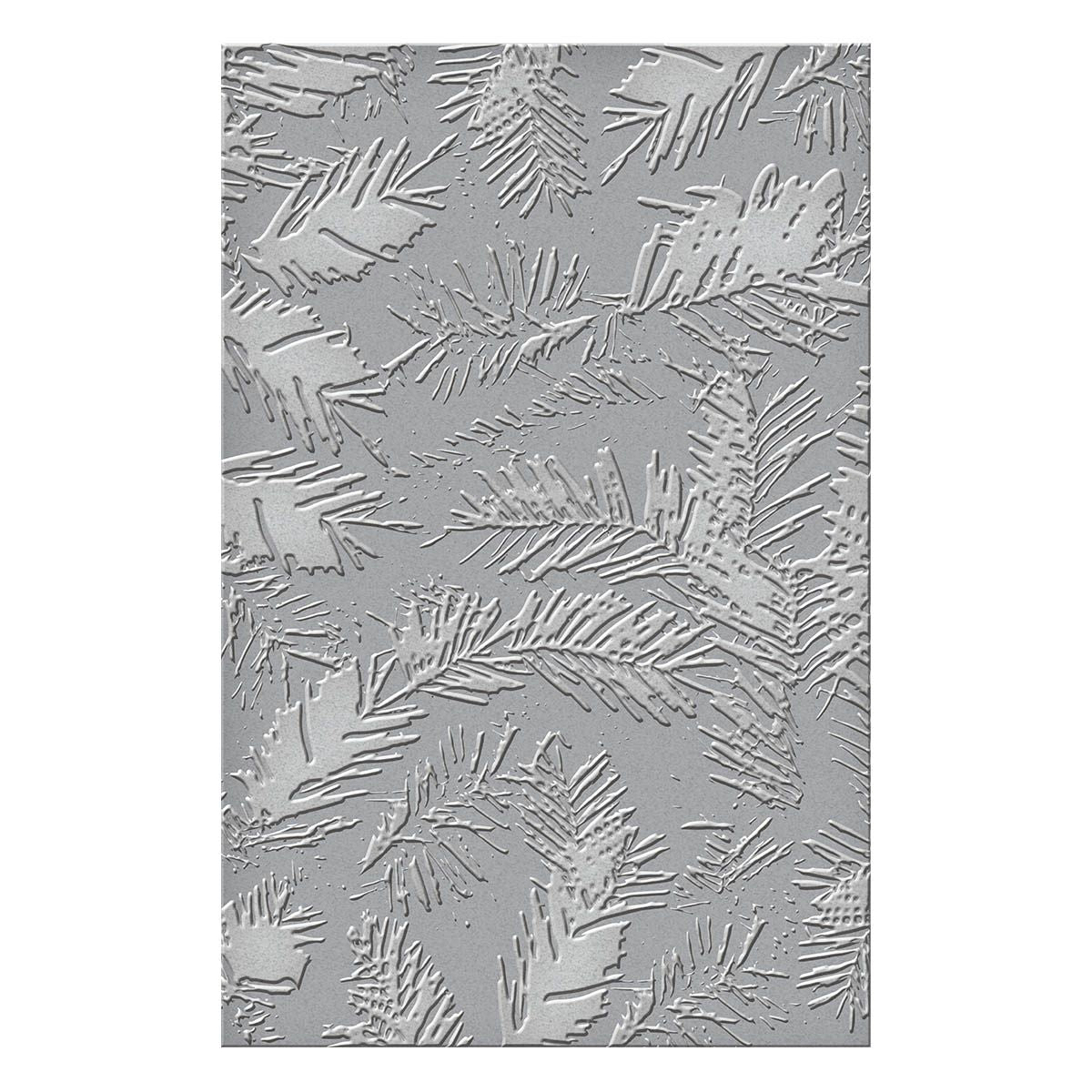 The Spellbinders In the Pines Embossing Folder is a part of the Make It Merry Collection. This embossing folder creates a beautifully detailed background of pine needle branches, extending all around the design. It is designed to cover a standard card front, ranging from A2 size to 5 x 7 inches, including the popular slimline card size. This embossing folder is a perfect dimensional addition for your holiday and outdoor-themed projects, providing a touch of natural beauty. The approximate size of the embossing folder is 8.50 x 5.50 inches, allowing for versatile and stunning embossed designs on your paper crafts.