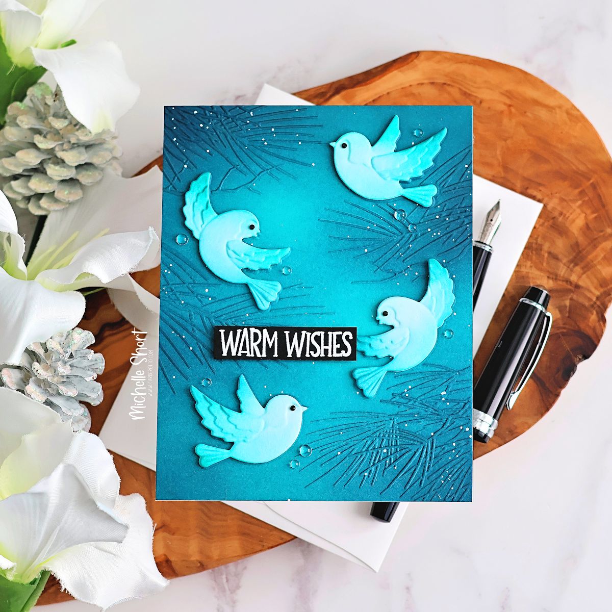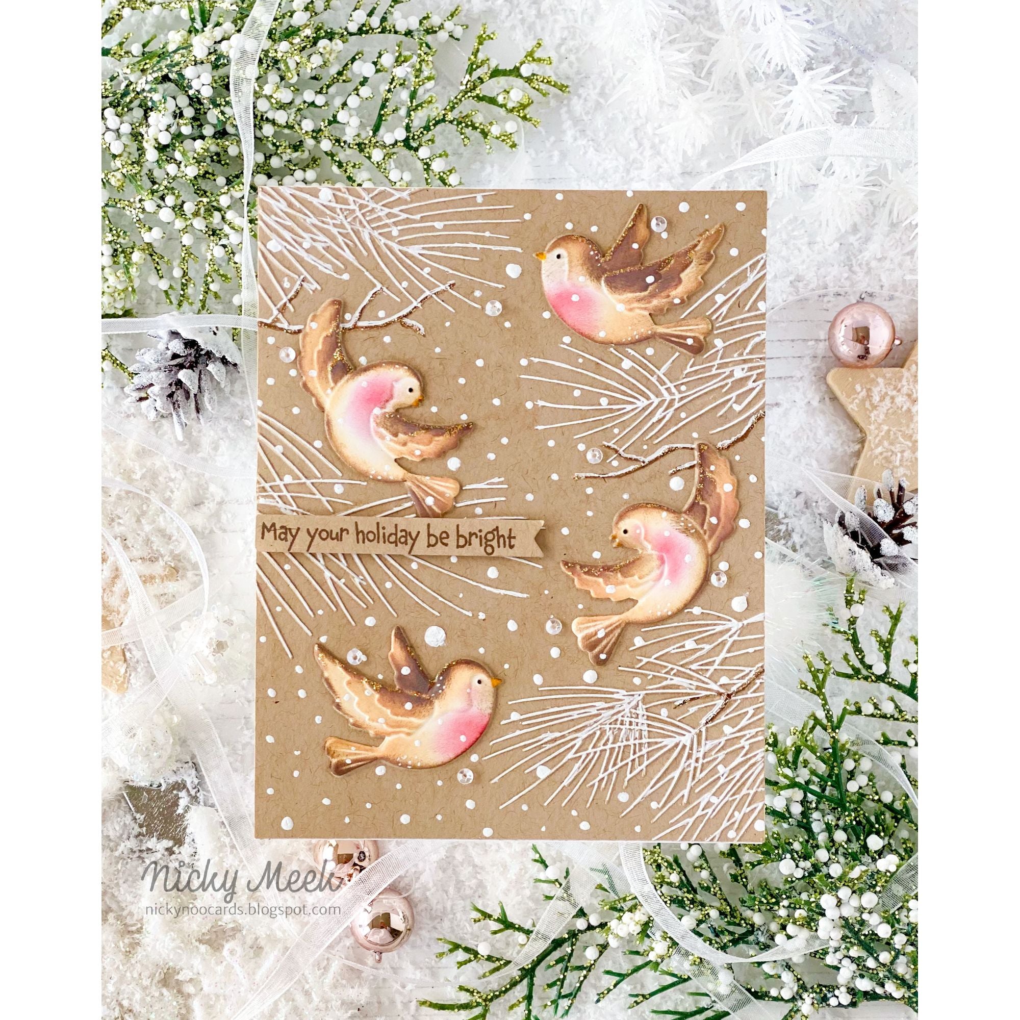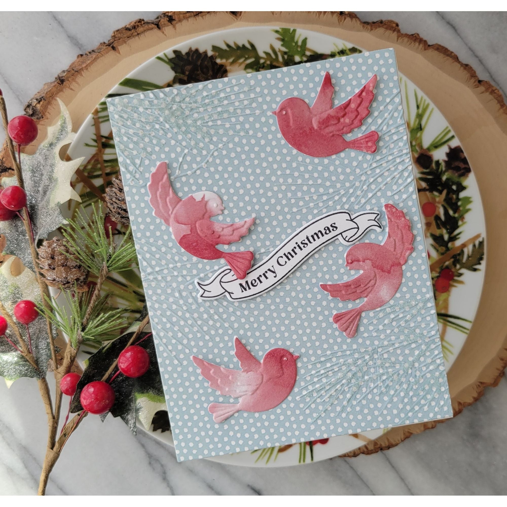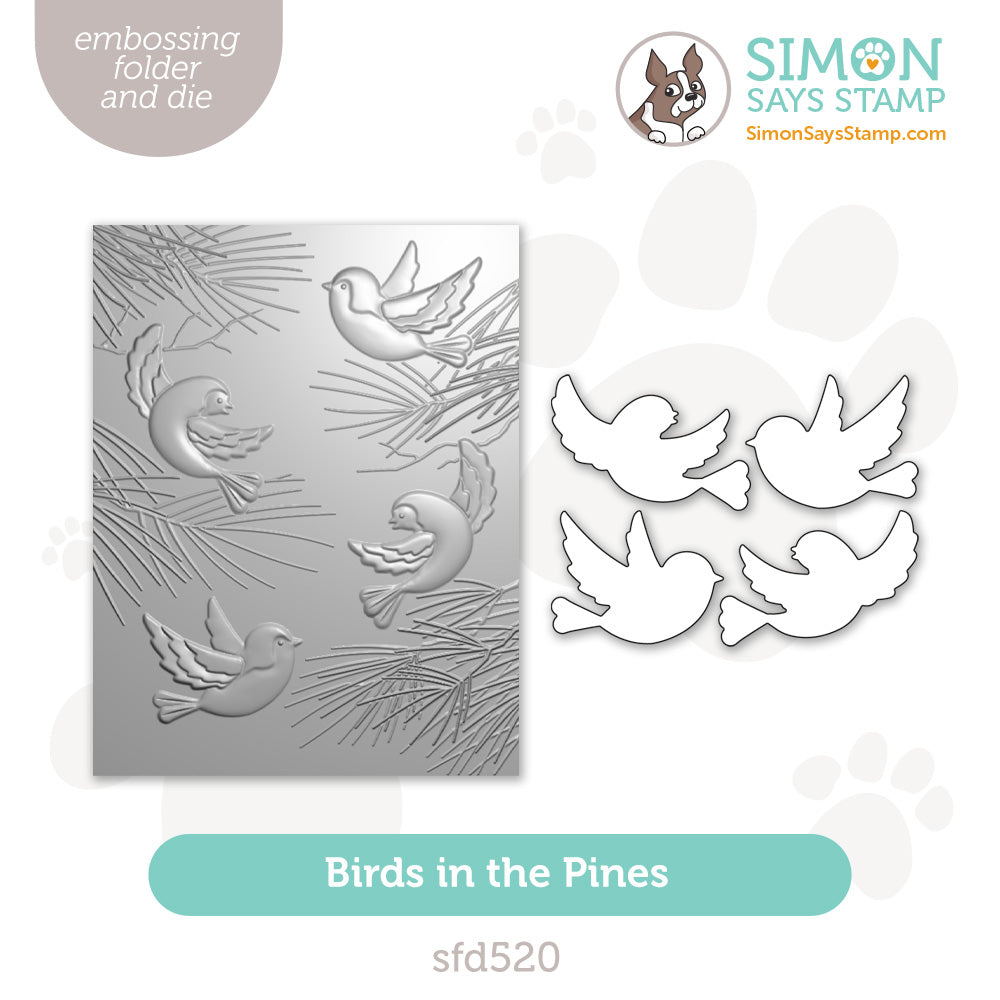 The Birds in the Pines embossing folder and dies create a lively woodland scene featuring four birds nestled and playing among evergreen branches. The folder delivers deep, detailed texture, while the coordinating dies cut out each bird individually for easy layering and added dimension. (We recommend die cutting first to avoid flattening the embossing.)