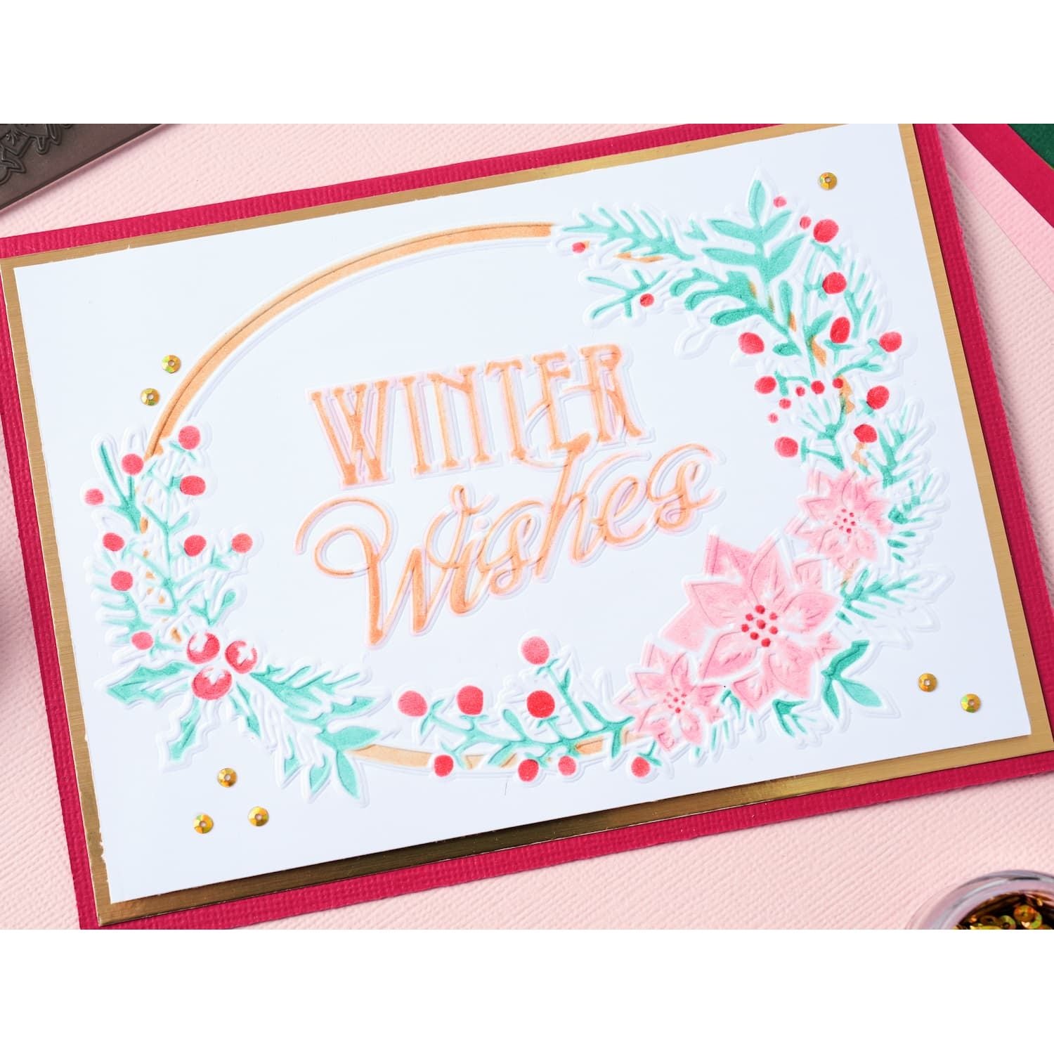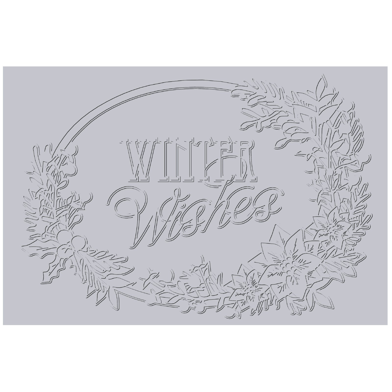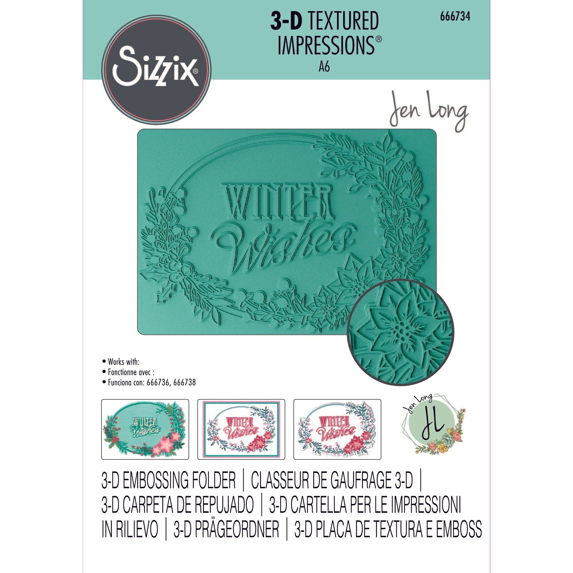 The Sizzix Winter Wishes 3D Embossing Folder by Jen Long is a perfect tool for sending holiday greetings through stunning cards, enchanting gift tags, and captivating decorations that embody the magic of the season. This embossing folder features an oval design surrounded by holiday greenery, including pine sprigs, leaves, holly, berries, and poinsettias. It also includes the words "Winter Wishes." This 3-D Textured Impressions Embossing Folder is designed to work seamlessly with the Winter Wishes 2 Thinlits Dies (666736) and the Winter Wishes #A6 Layered Stencils 3 (666738). Choose to use these tools separately for simpler, yet effective, designs, or combine them to add depth and interest, creating stunning seasonal makes.  As a product of Sizzix, an Ellison brand, this 3D Embossing Folder offers the deepest and boldest embossing experience, transforming ordinary cardstock, paper, metallic foil, or vellum into a textured masterpiece. Measuring approximately 6.25 x 4.25 inches, it is compatible with most embossing machines. For the best results, it is recommended to lightly mist both sides of your material with water before use and pass the folder through your machine three times. Ensure the cardstock is completely dry before adding any ink or embellishments to achieve a flawless finish.
