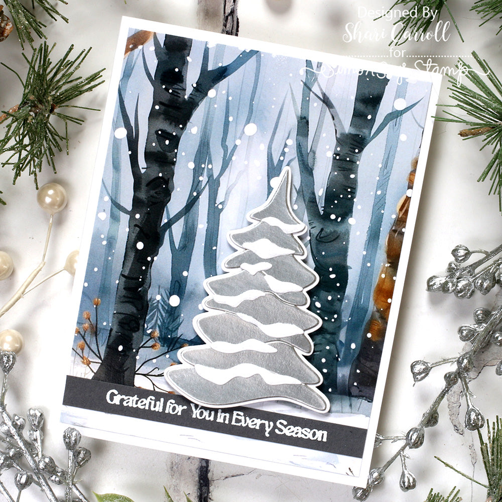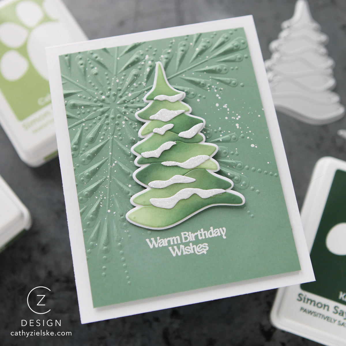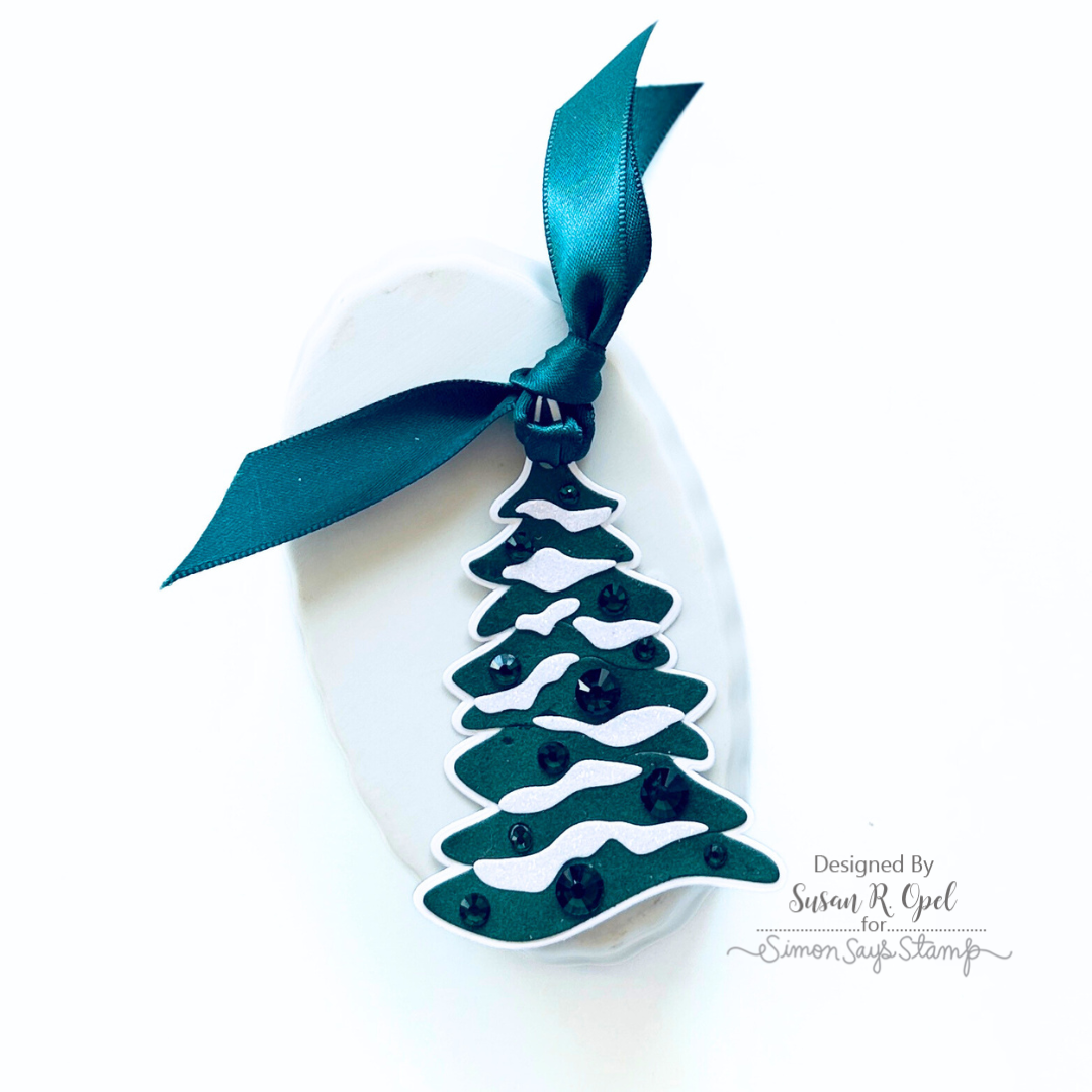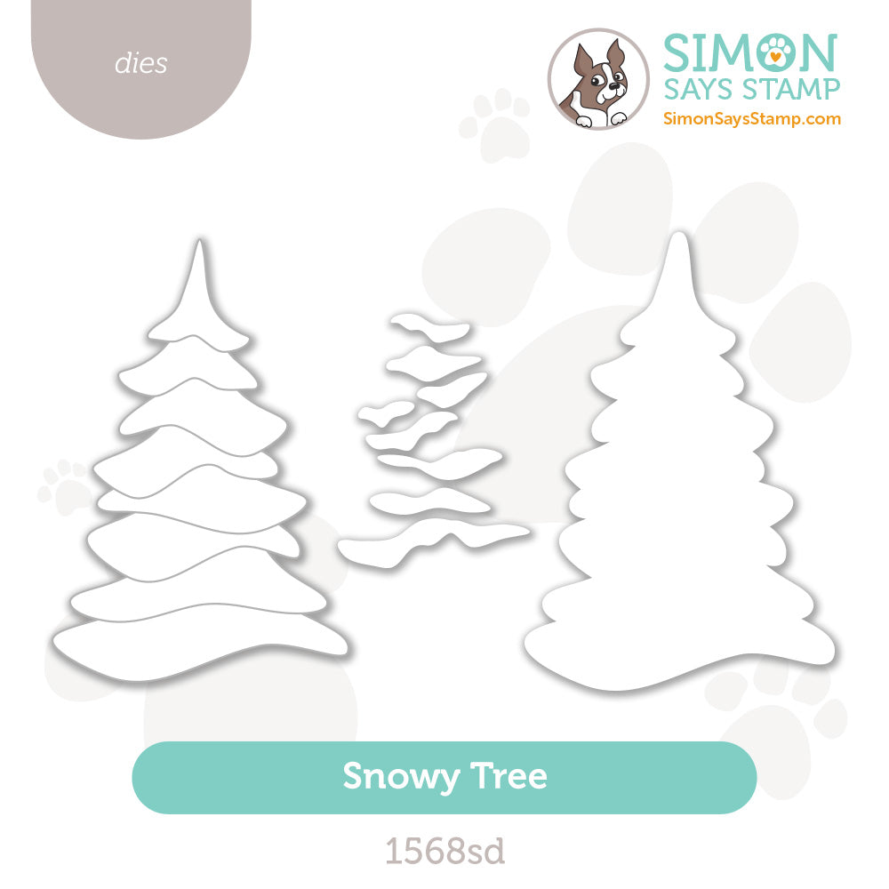 Simon Says Stamp Snowy Tree dies let you build a beautifully layered evergreen with winter charm and clean dimension. This set includes an outline die that cuts the full tree shape, an inner layering piece with embossed branch lines for added detail, and a separate die that creates snowy clumps to rest on the branches.
