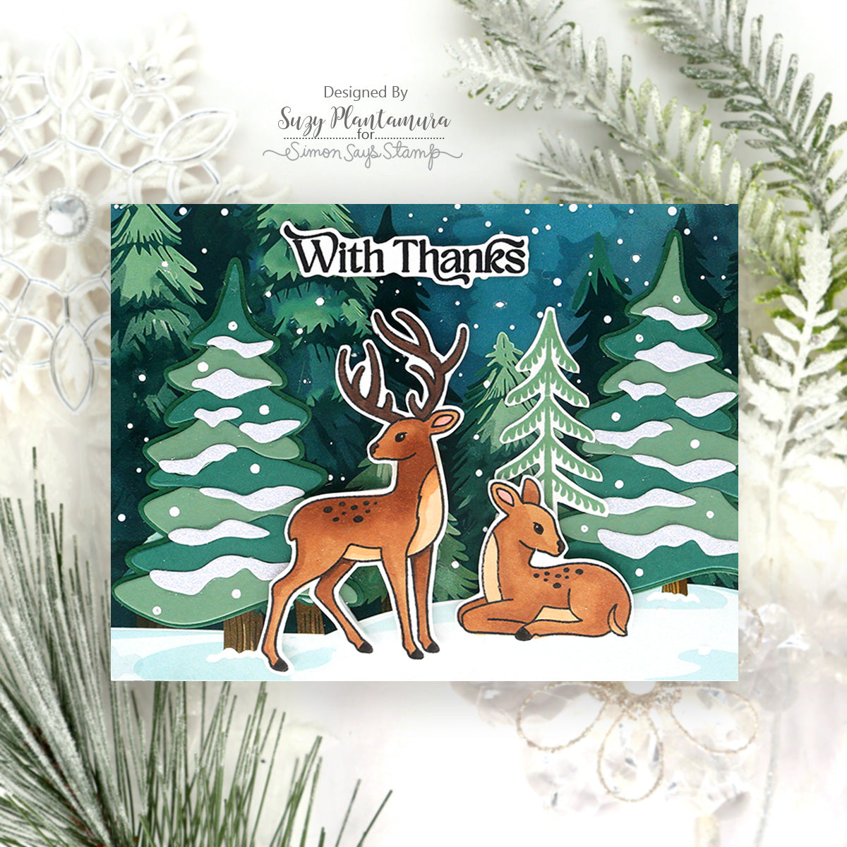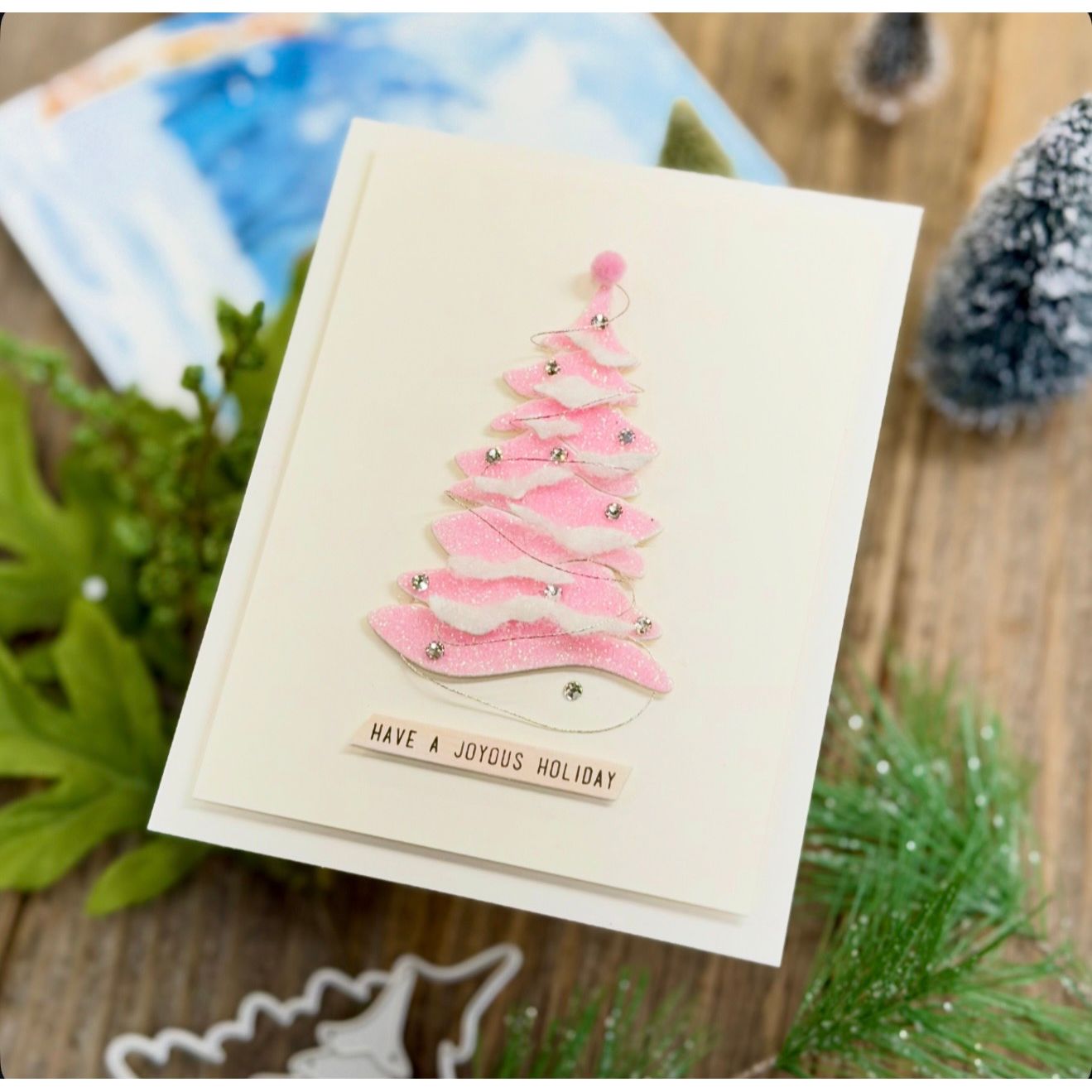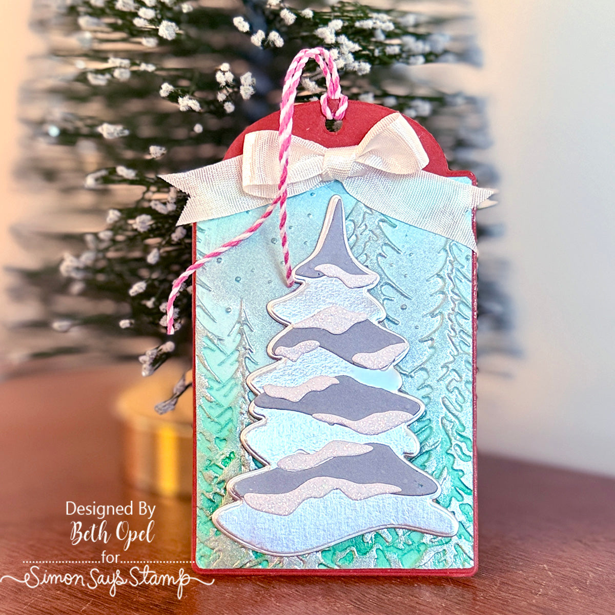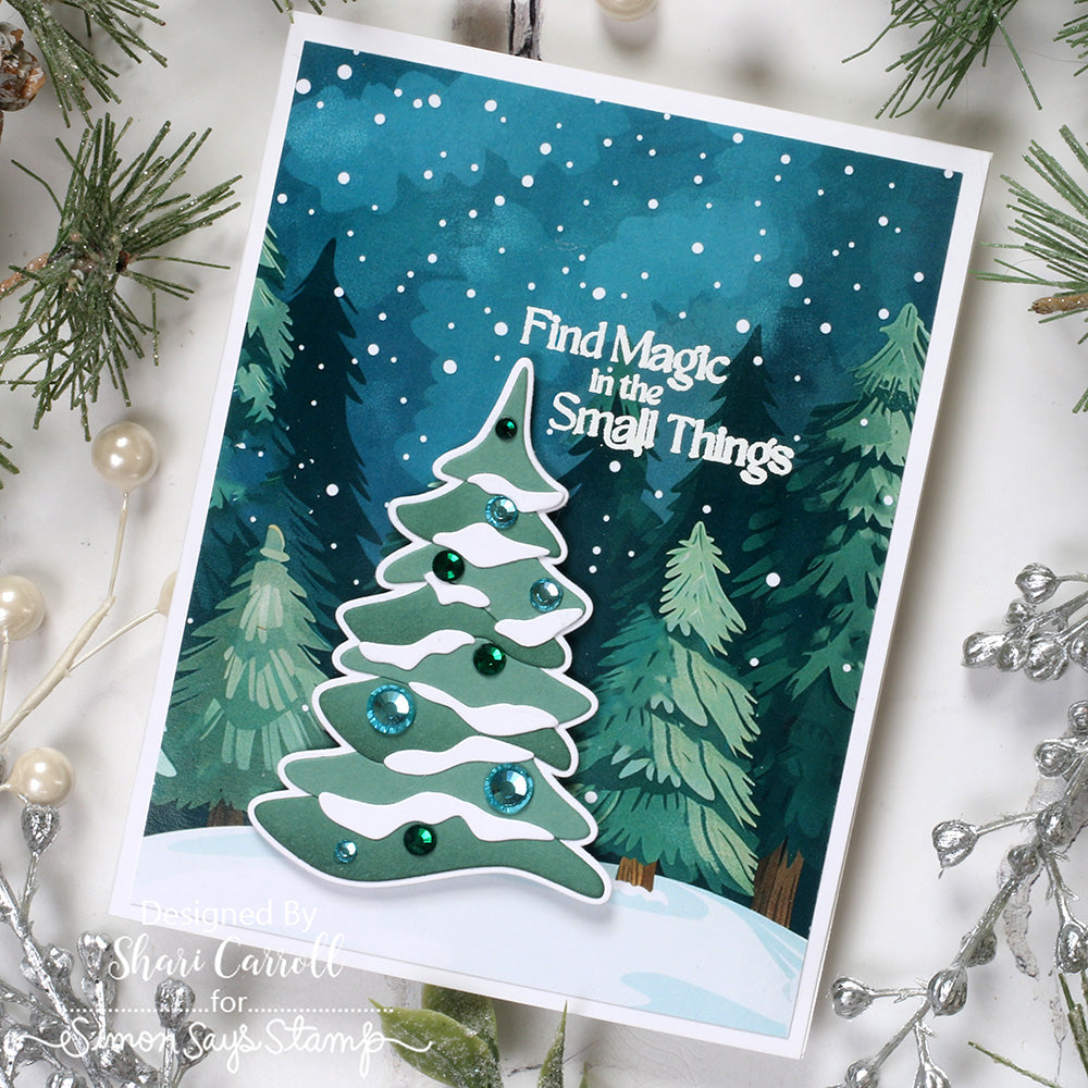 Simon Says Stamp Snowy Tree dies let you build a beautifully layered evergreen with winter charm and clean dimension. This set includes an outline die that cuts the full tree shape, an inner layering piece with embossed branch lines for added detail, and a separate die that creates snowy clumps to rest on the branches.
