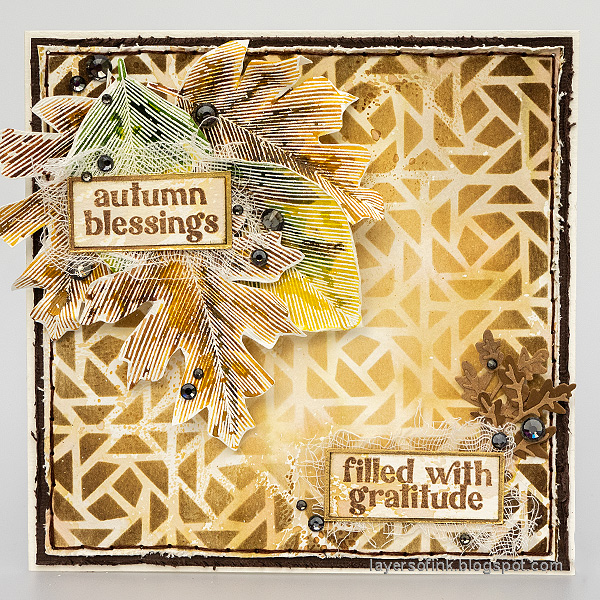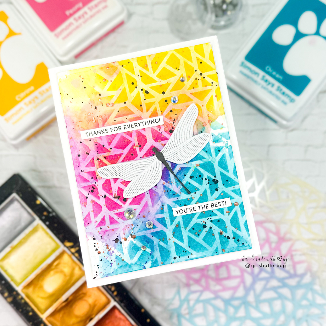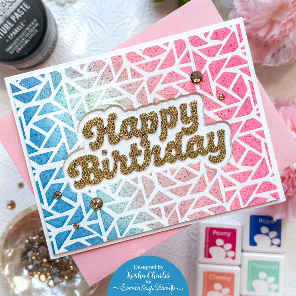 The Simon Says Stamp Octo stencil features a unique design that creates a background resembling a twiggy maze.