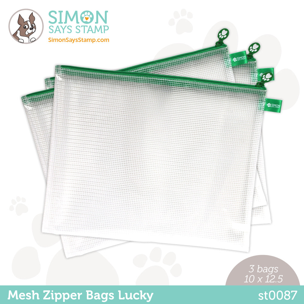 Our Simon Says Stamp Mesh Bags are a pawsitively perfect storage solution for all your crafty supplies! The large 10 x 12.5 inch size allows for full-sized 8.5 x 11 inch paper sheets to fit inside. The flexible makeup of this bag also gives room for bulkier items such as jars or tools. The mesh material has a slick coating, which makes for easy clean-up if you put inky brushes into it. Not just for your craft room, our Mesh Bags are even great for traveling; place your favorite supplies inside and carry them with you for on-the-go crafty time! This is a pack of 3 bags.