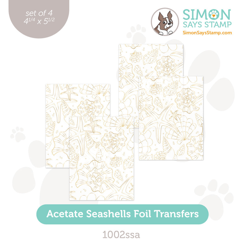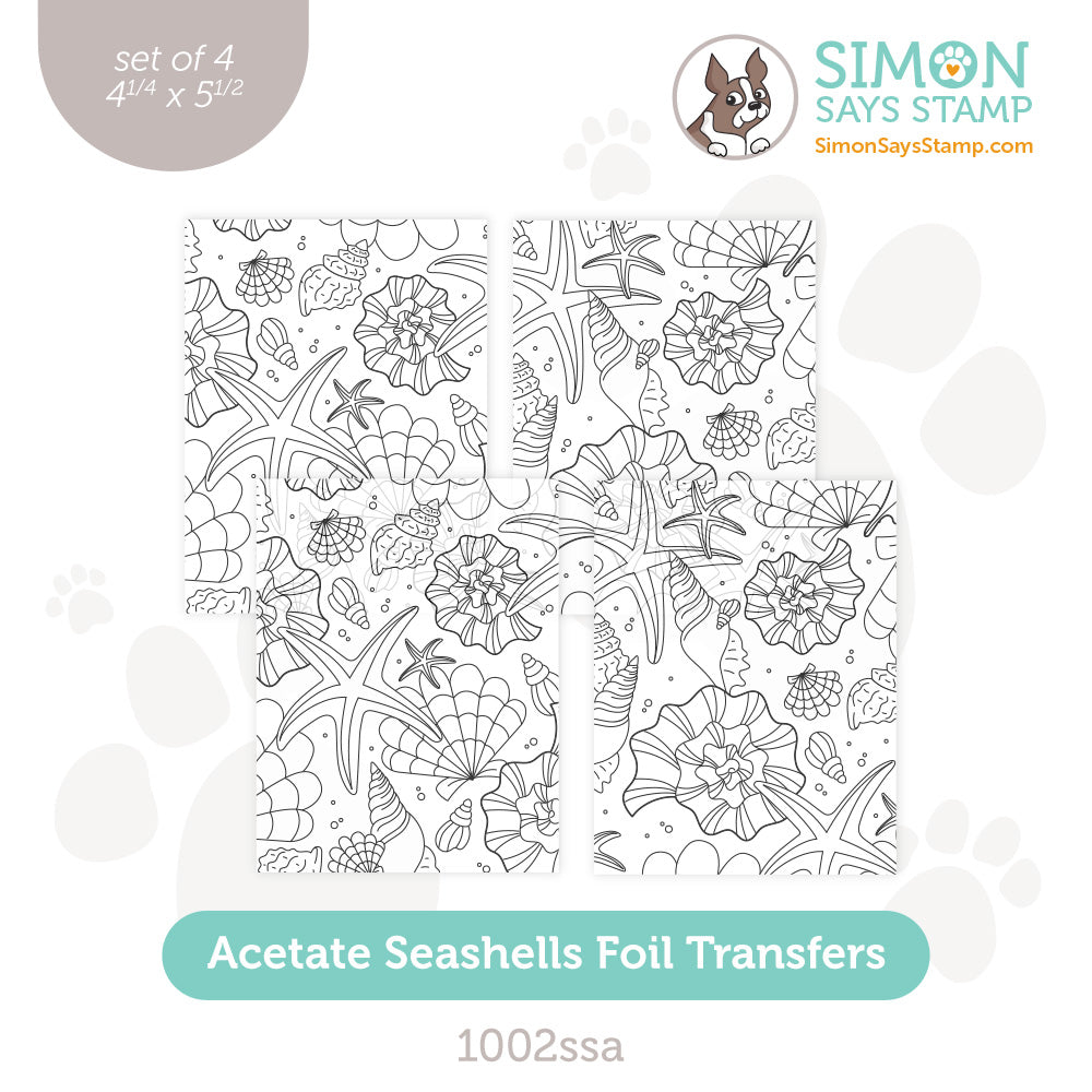 Transform your creations into seaside treasures with Simon Says Stamp Seashells foil transfer sheets. Printed with toner on acetate, these cards showcase a background panel of illustrations of seashells.