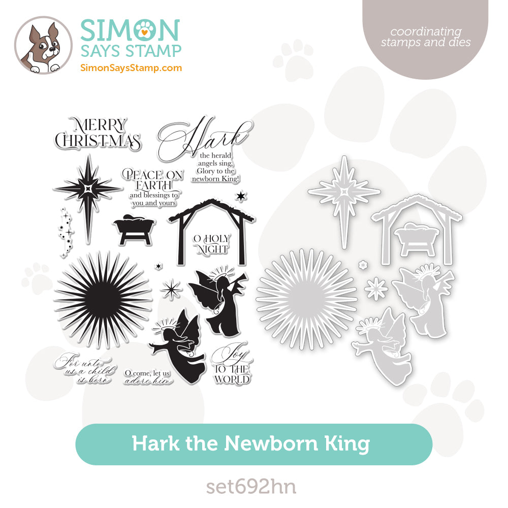 Introducing the Simon Says Stamp Hark the Newborn King stamp and die set! This exquisite 6 x 8 inch clear stamp set and coordinating dies are must-haves for all your holiday crafting needs. The set features beautifully detailed silhouette images of stars, a stable, a manger, and angels, capturing the essence of the nativity scene.