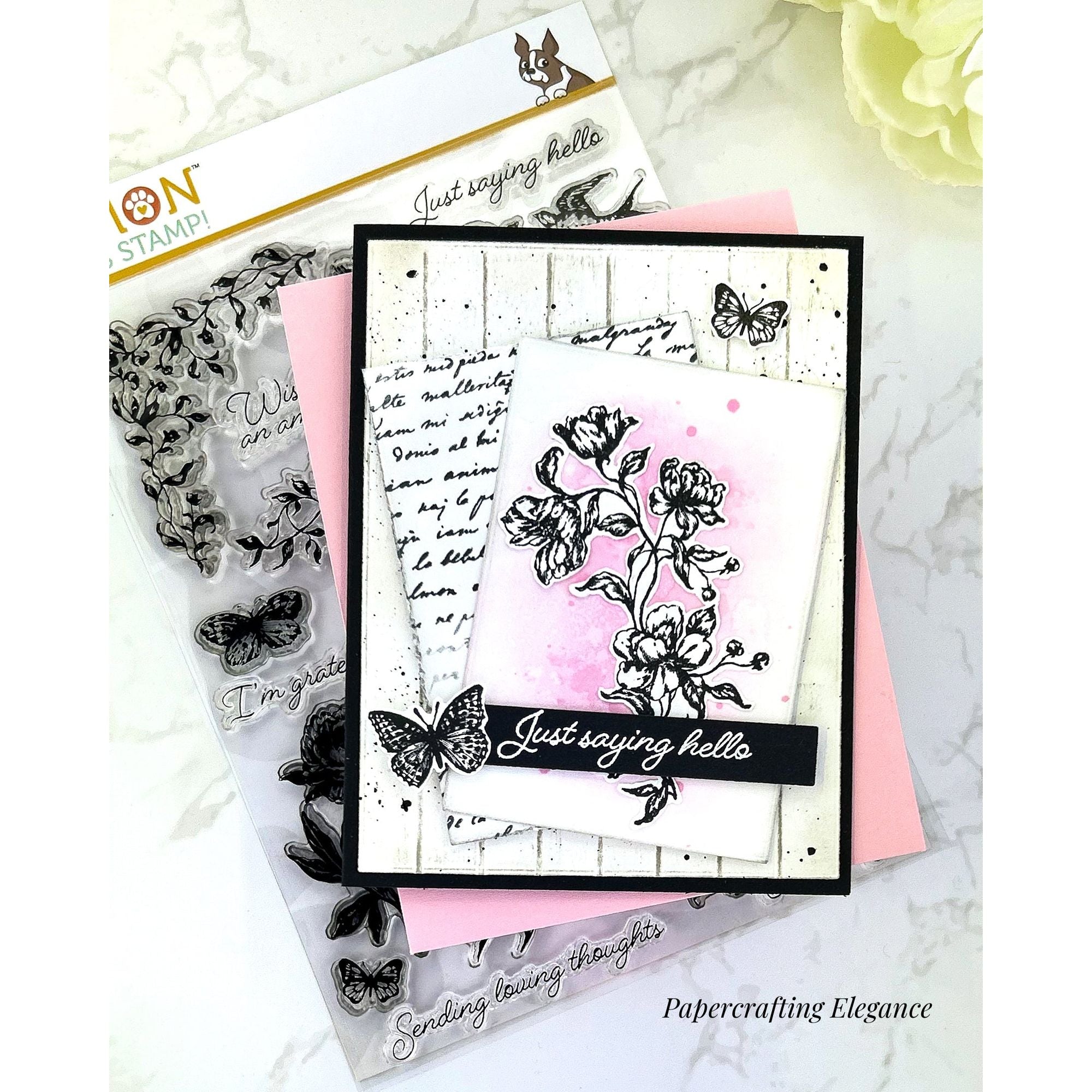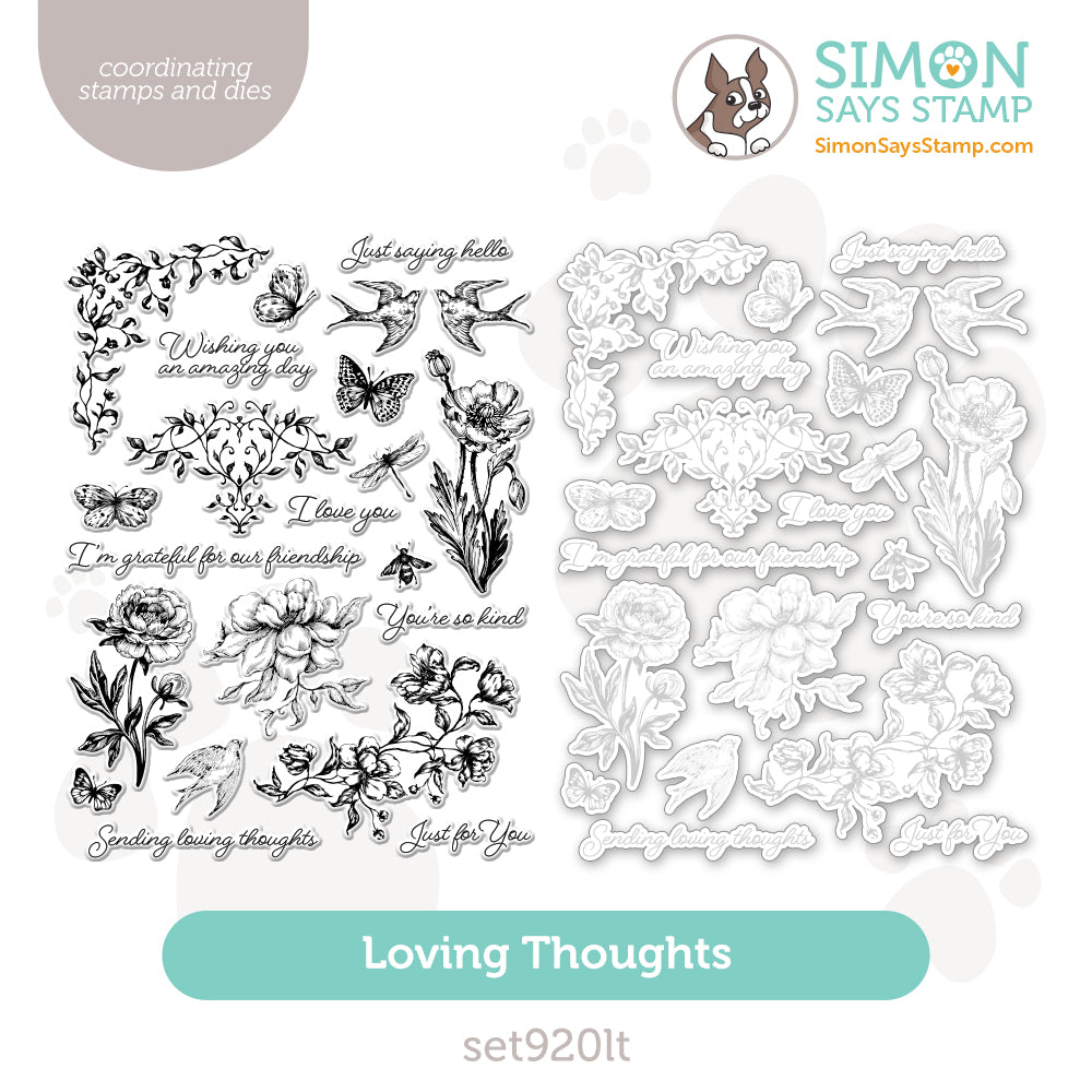 The Simon Says Stamp Loving Thoughts stamp and die set brings vintage charm and timeless elegance to your crafting. This beautifully designed set features nostalgic, etched-style images, including delicate vines, graceful birds, fluttering butterflies, a dragonfly, a bumblebee, and an assortment of floral stems and flourishes. Each illustration exudes classic sophistication, perfect for adding an antique-inspired touch to your projects.