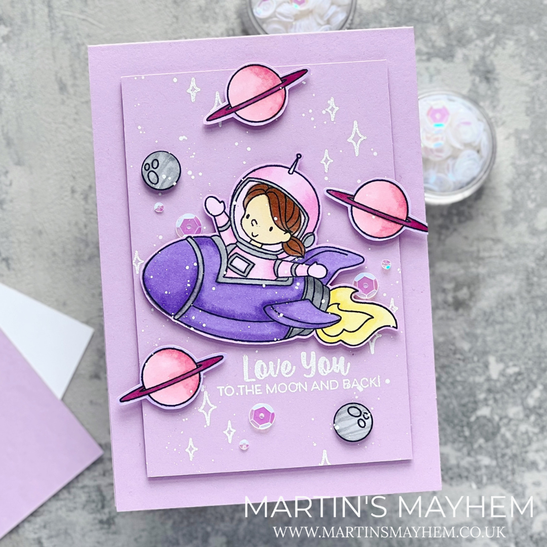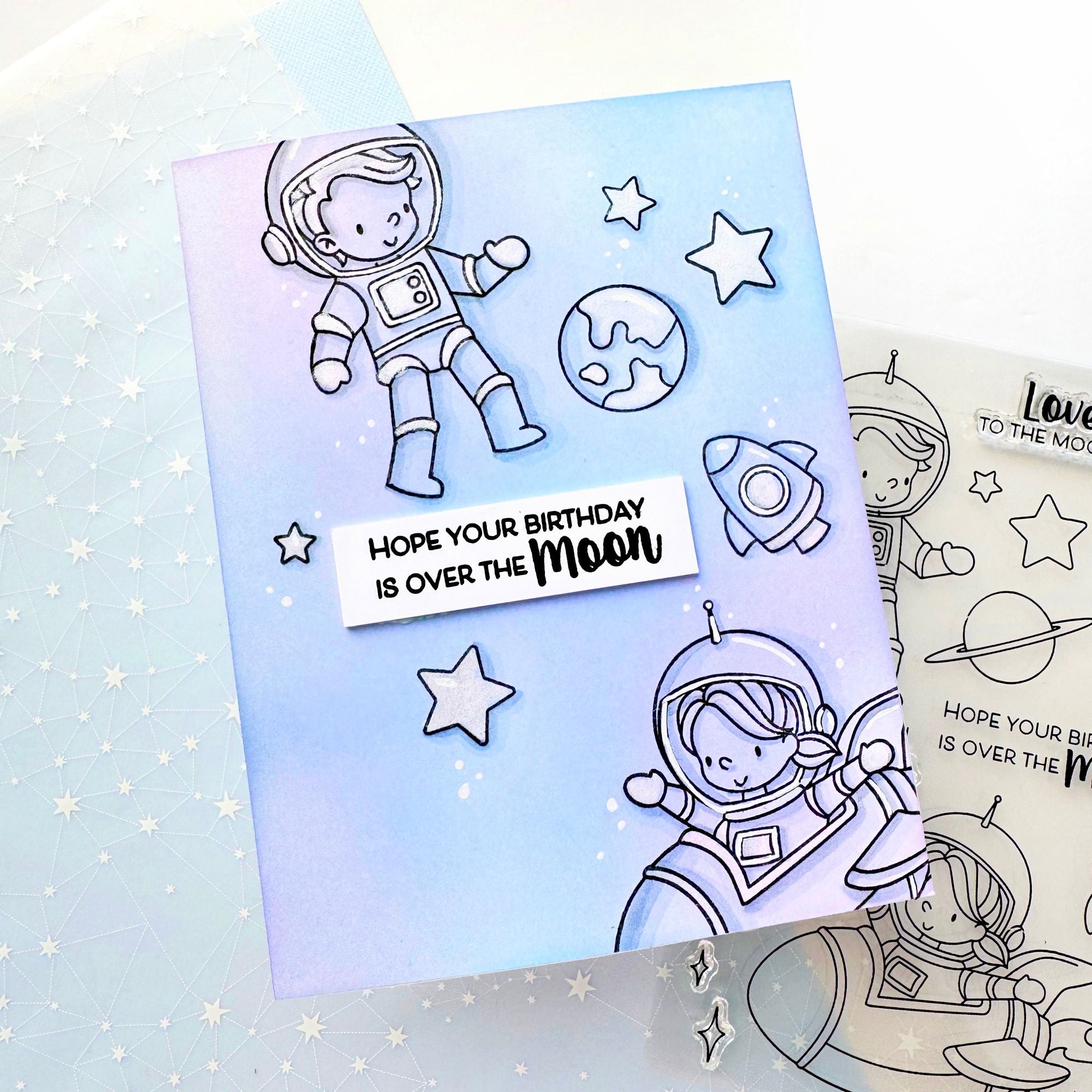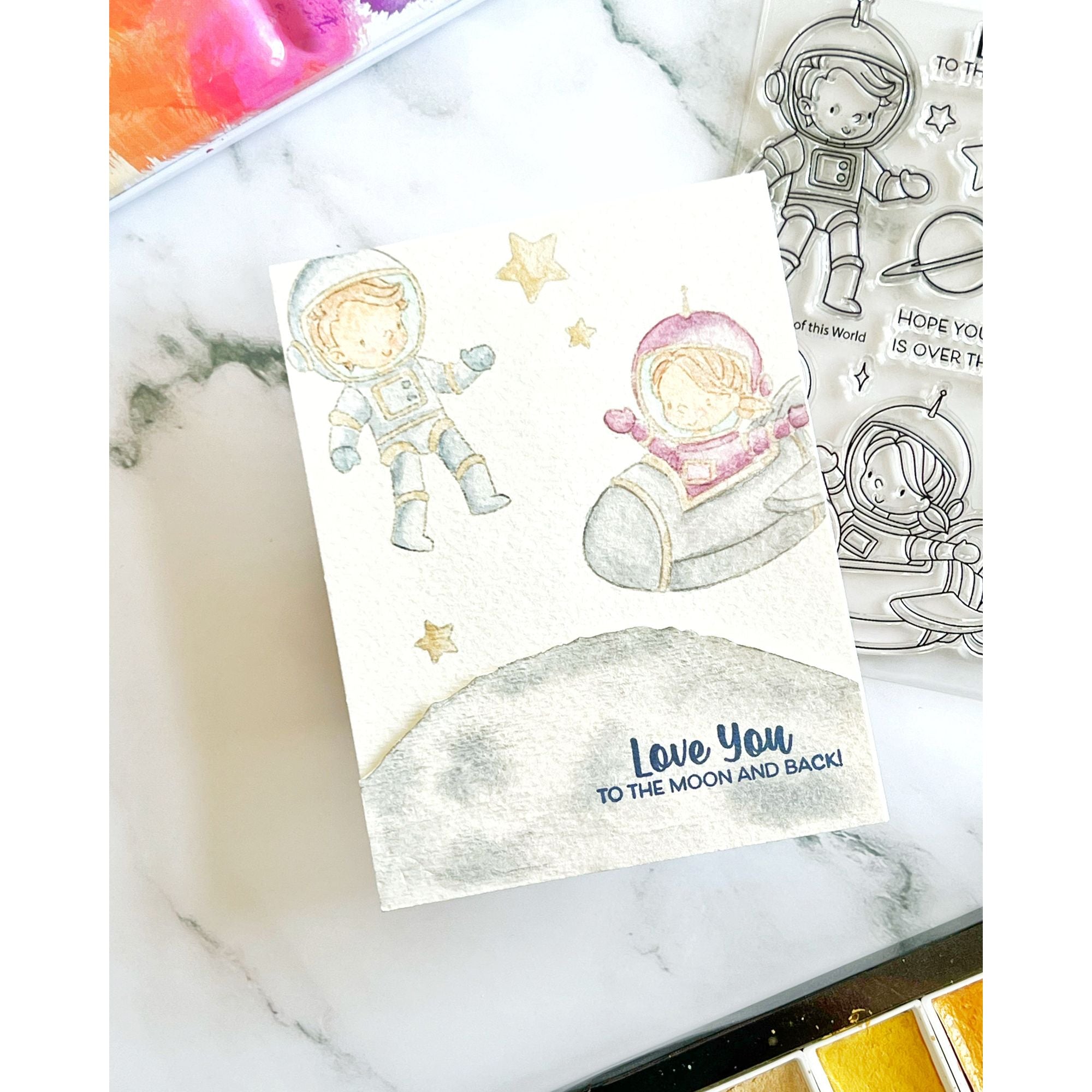 Additional images include planets, stars, sparkles, a friendly alien, and a smaller rocketâperfect for building a whimsical outer space scene. With two moon-themed sentiments included, this set is ideal for cards, tags, and projects that are sure to send smiles into orbit: