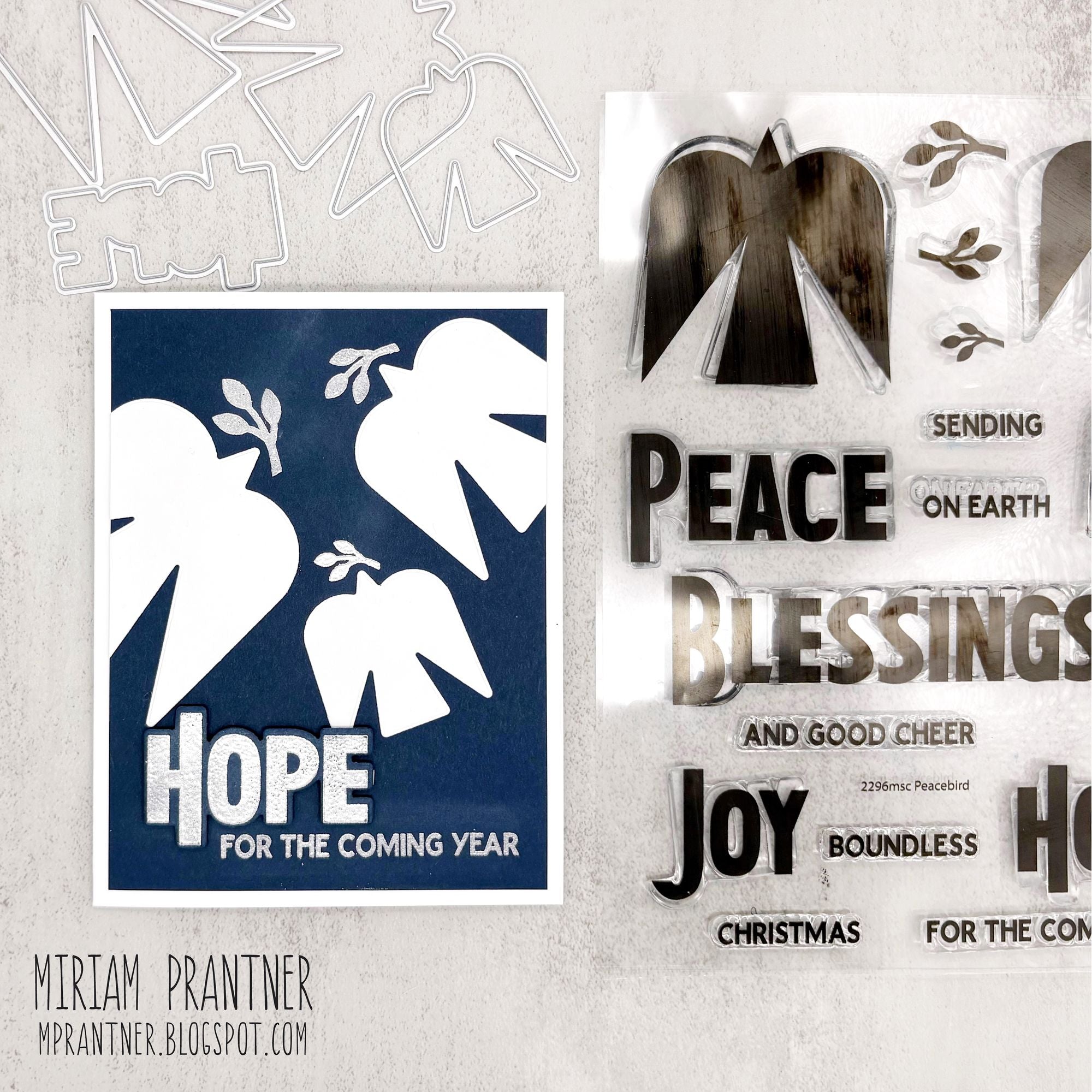 The dies cut out all of the clean, modern images and sentiments with precision. Note: One of the dies (Hopeful Peacebird) is the same size as the largest image in the stamp set, but it cuts with no border. The coordinating die leaves a border around the stamped image.