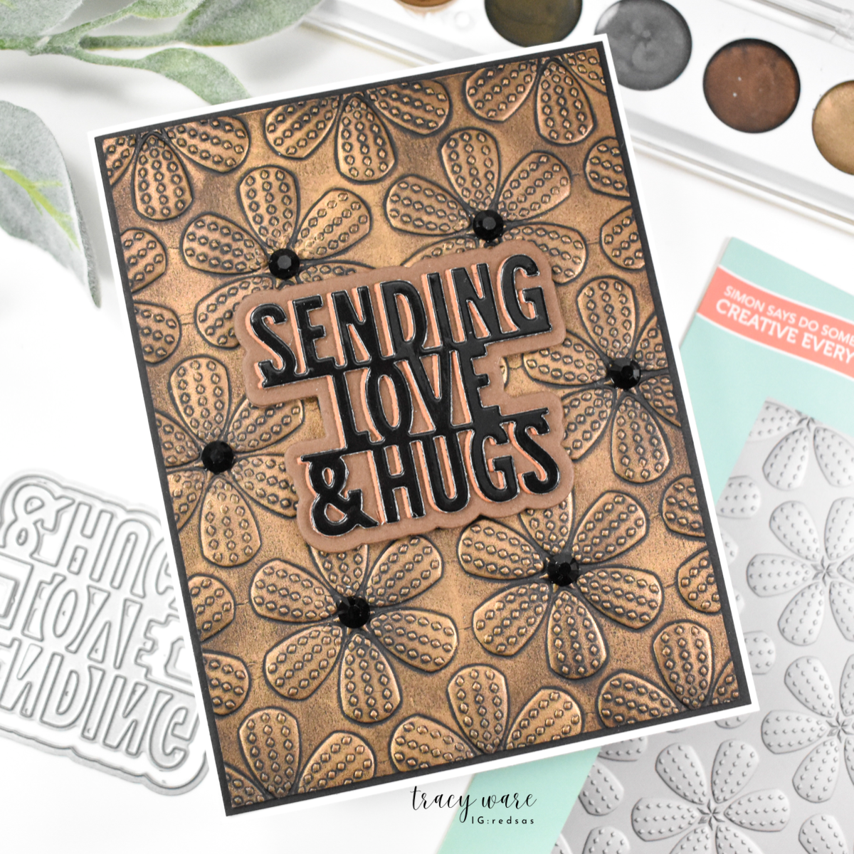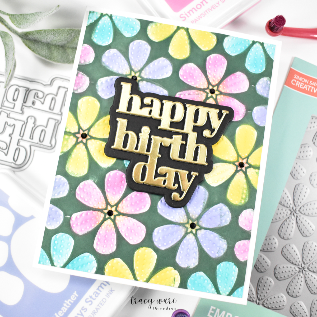 The Simon Says Stamp Stitched Flowers embossing folder creates a charming background of daisy-shaped blooms arranged in a regular alternating row pattern. Each flower features a starburst-style center surrounded by stitched, stripe-like petals, giving the design both texture and whimsy.