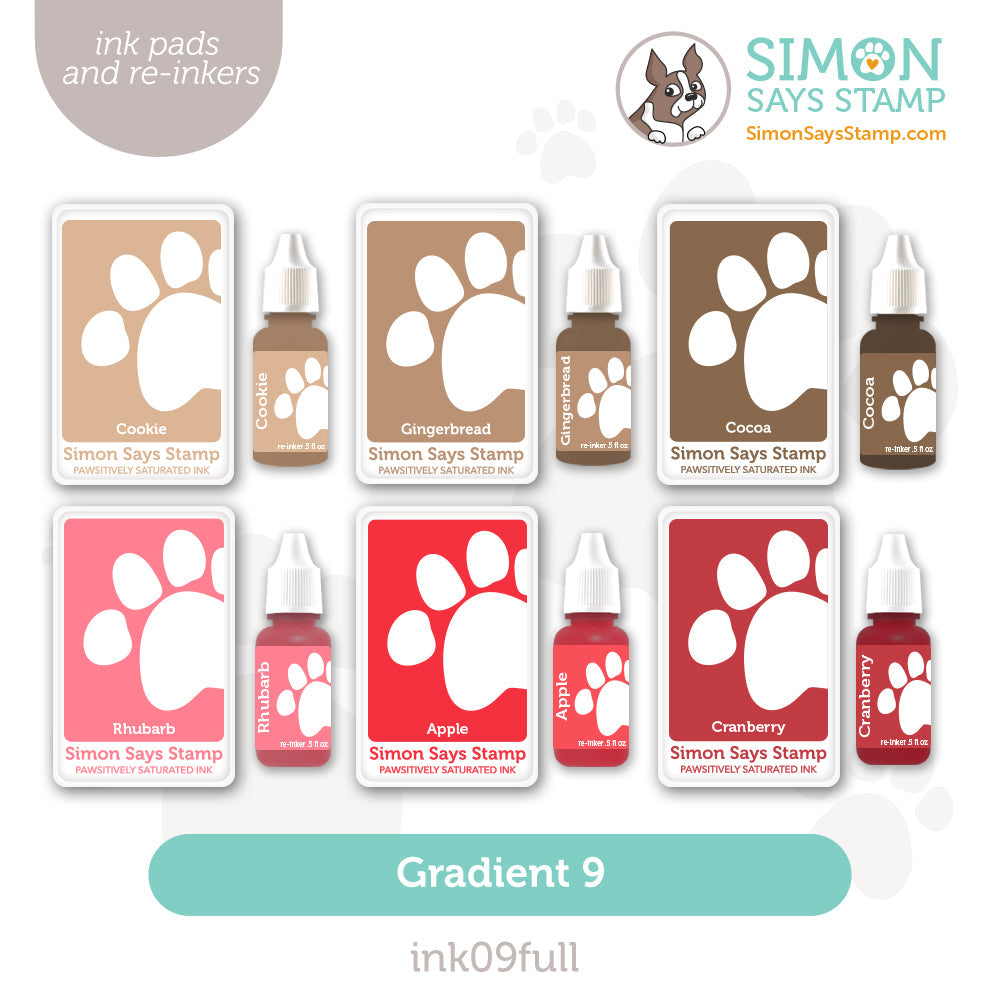 Introducing the Simon Says Stamp Pawsitively Saturated Ink Pad and Re-inkers Gradient 9! This set includes six full-sized saturated dye ink pads and re-inkers in warm brown and red tones. The colors in this set are: