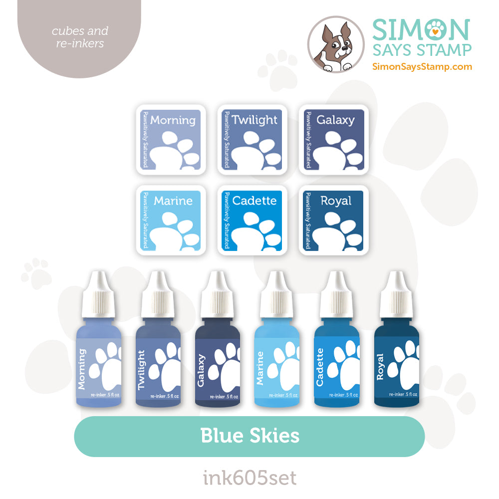 Our popular Simon Says Stamp Pawsitively Saturated Ink is now available in cube form! The versatile Blue Skies 6-pack and re-inkers can be used for a wide variety of techniques and projects.
