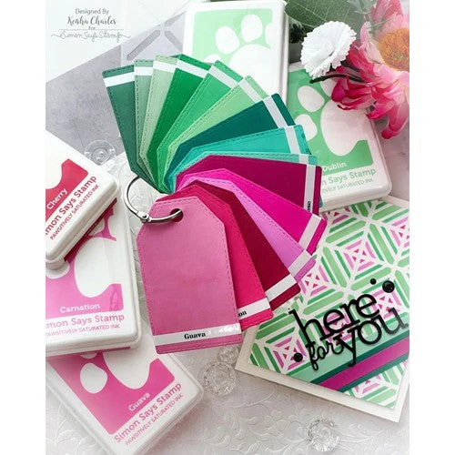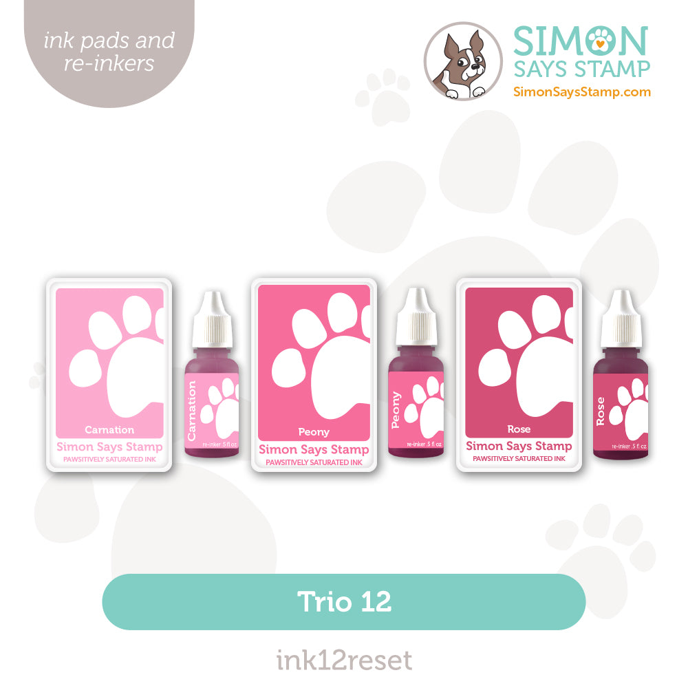 Introducing the Simon Says Stamp Pawsitively Saturated Ink Pad and Re-inkers Trio 12! This set includes three full-sized saturated dye ink pads in pink tones and their corresponding re-inkers. The colors in Trio 12 are: