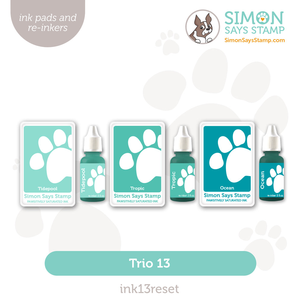 Introducing the Simon Says Stamp Pawsitively Saturated Ink Pad and Re-inkers Trio 13! This set includes three full-sized saturated dye ink pads in aqua tones and their corresponding re-inkers. The colors in Trio 13 are: