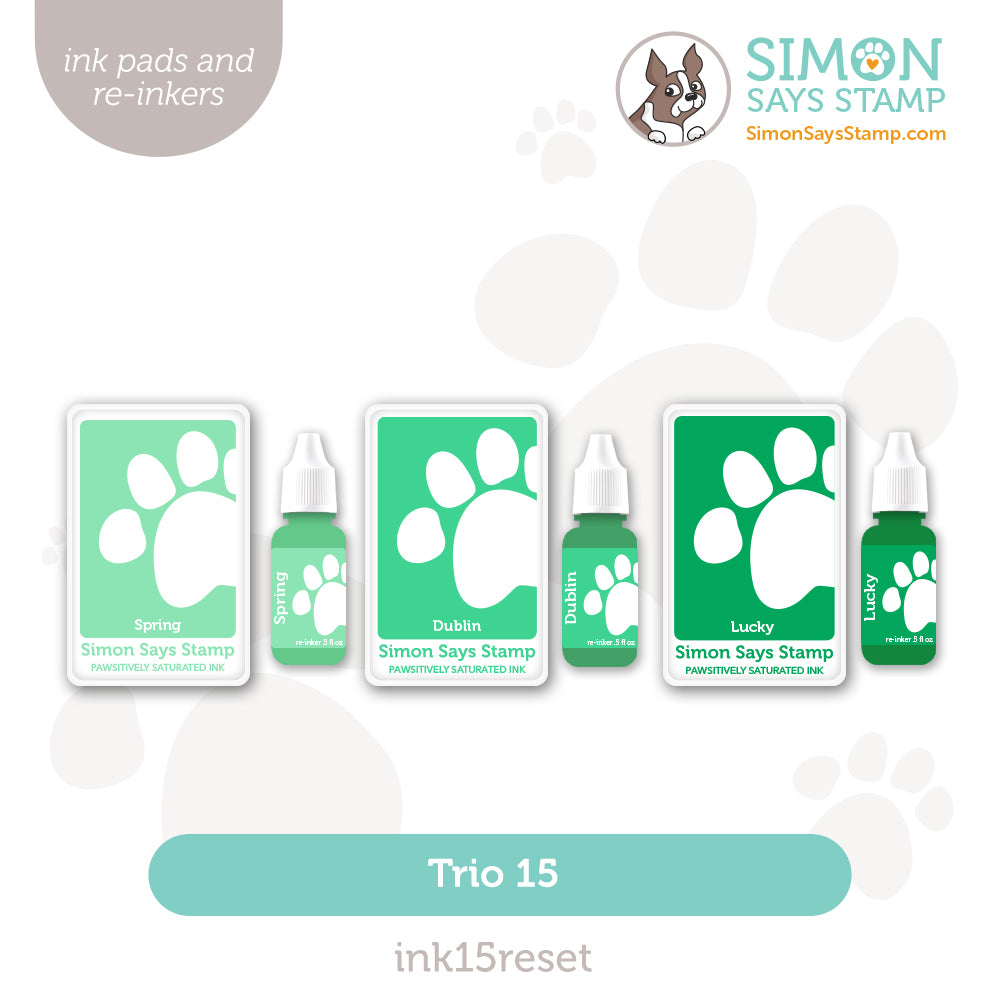 Introducing the Simon Says Stamp Pawsitively Saturated Ink Pad Trio 15! This set includes three full-sized saturated dye ink pads in green tones. The colors in Trio 15 are: