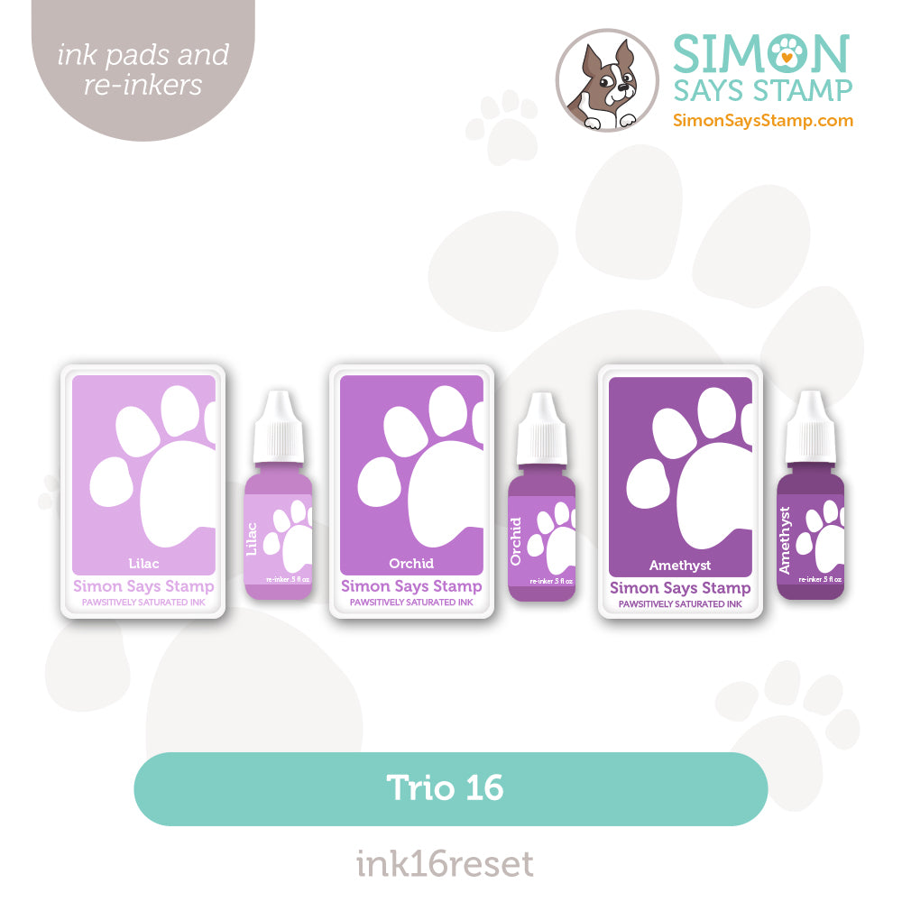 Introducing the Simon Says Stamp Pawsitively Saturated Ink Pad Trio 16! This set includes three full-sized saturated dye ink pads in purple tones. The colors in Trio 16 are: