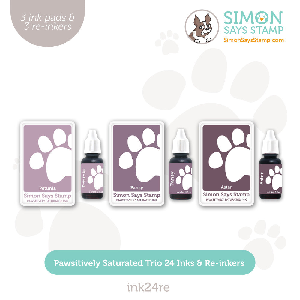 Introducing the Simon Says Stamp Pawsitively Saturated Ink Pad Trio 24! This set includes three full-sized saturated dye ink pads in purple tones and their corresponding re-inkers. The colors in Trio 24 are: