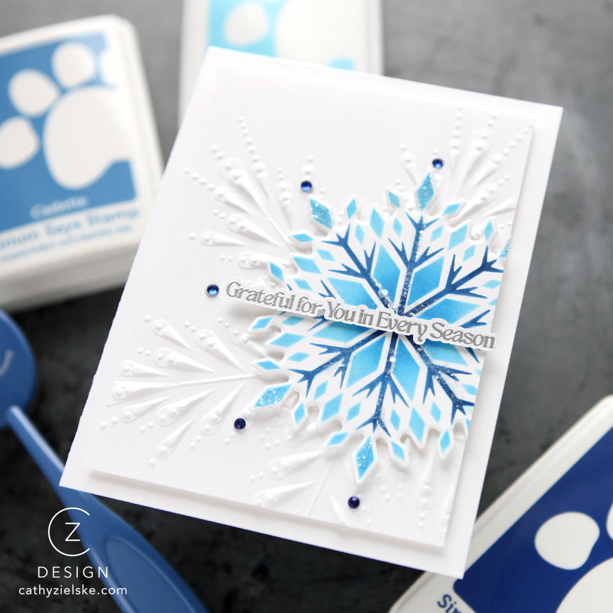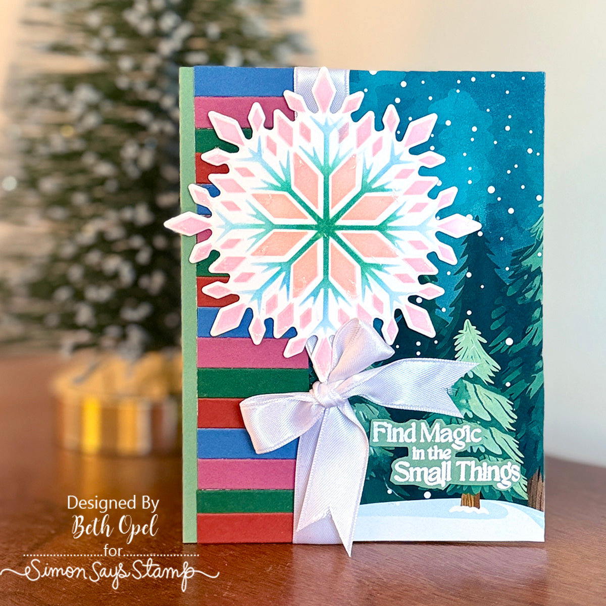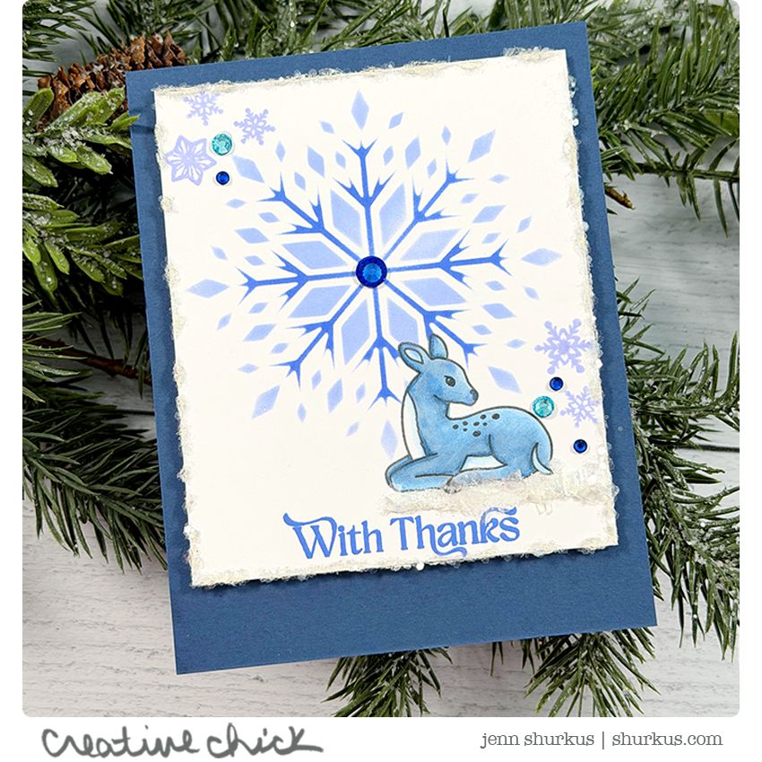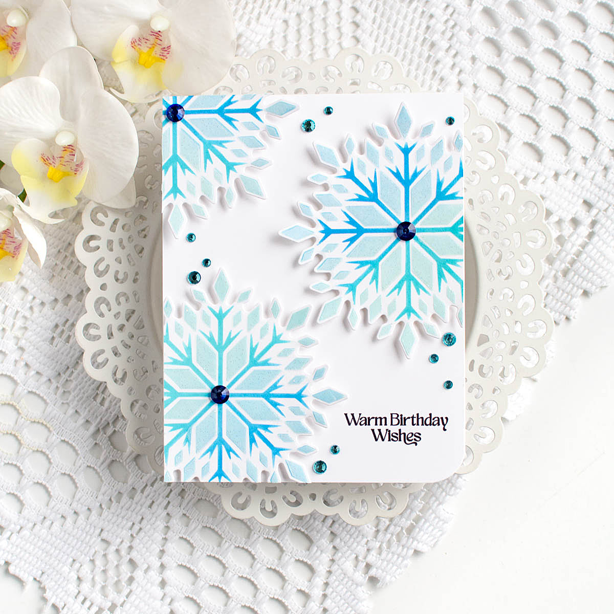 Simon Says Stamp Crystal Snowflake stencil set makes it easy to create a striking snowflake focal point with beautiful depth and detail. This layering stencil set is designed to work in two passes, allowing you to blend inks or apply two different colors or textures of paste for a dimensional, crystal-like effect.