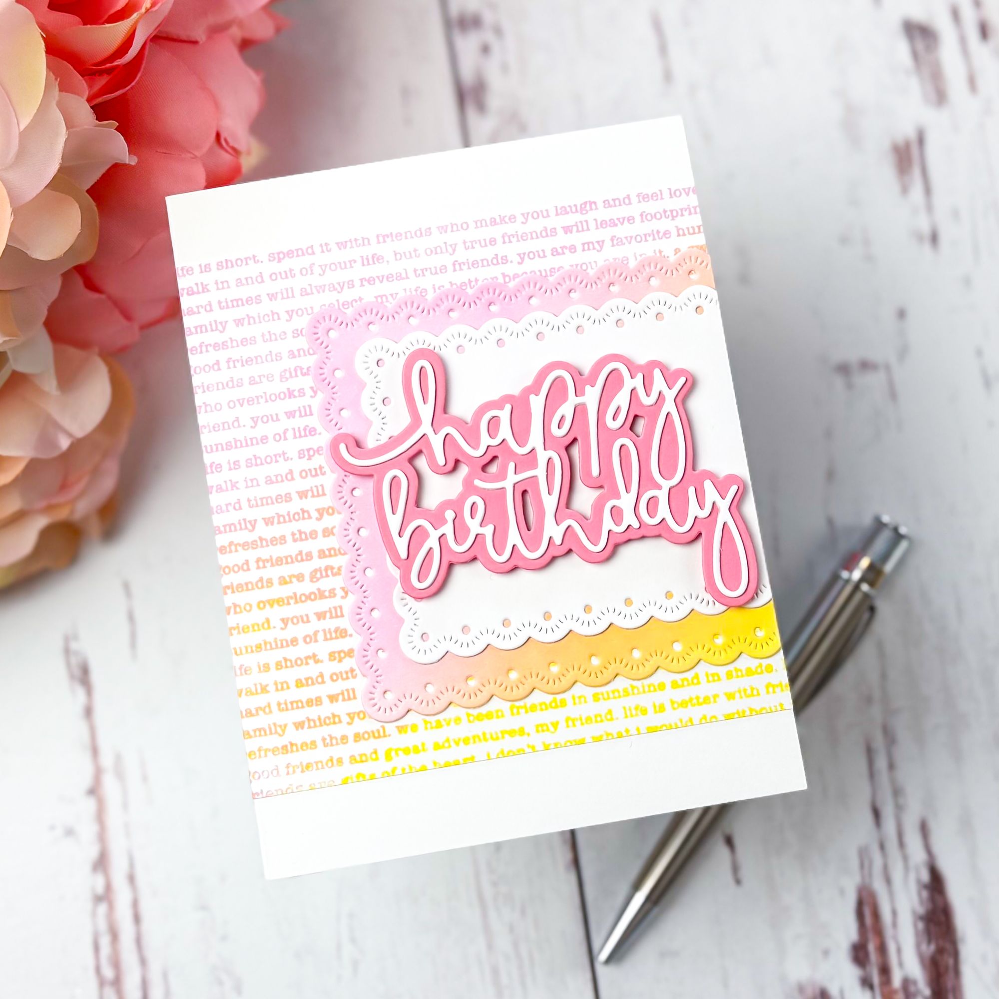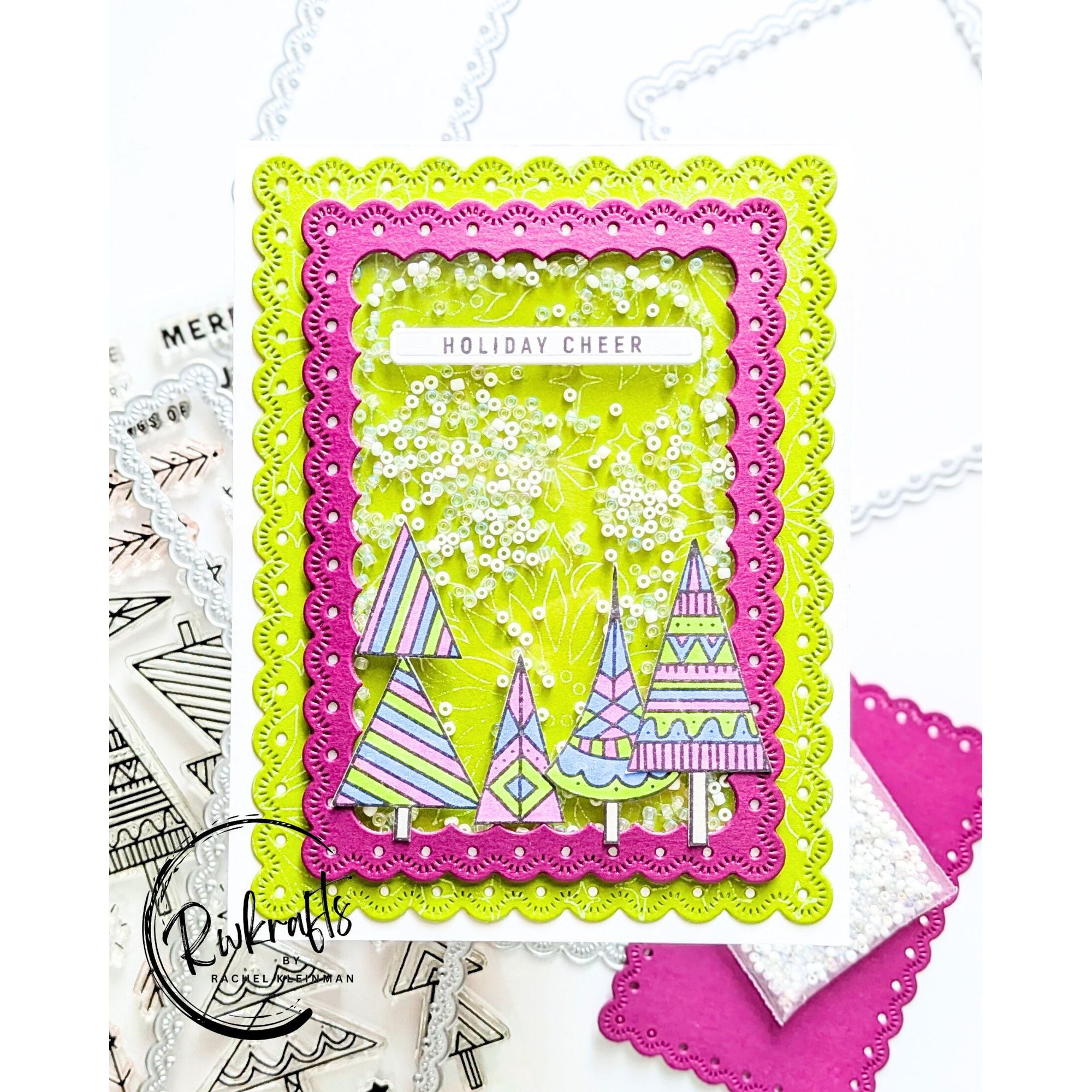 The Simon Says Stamp Eyelet Layer Frames die set includes a nesting collection of rectangles with scalloped edges, open dot details, and delicate etched accents that mimic classic eyelet fabric.
