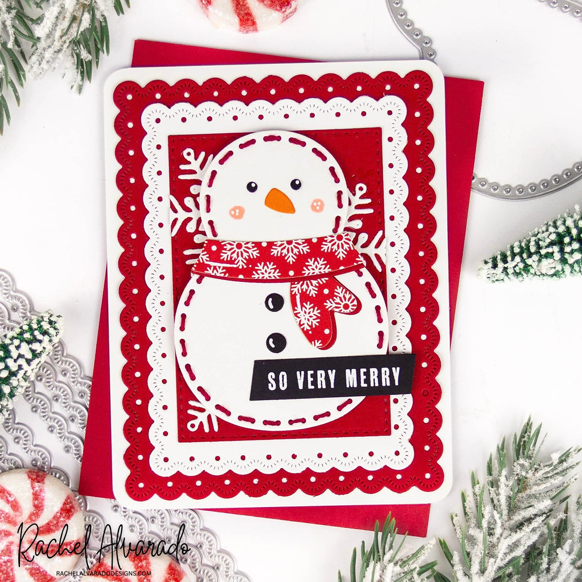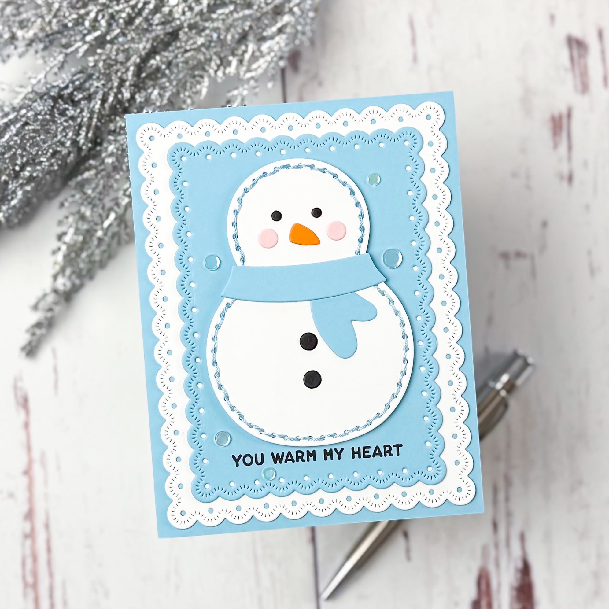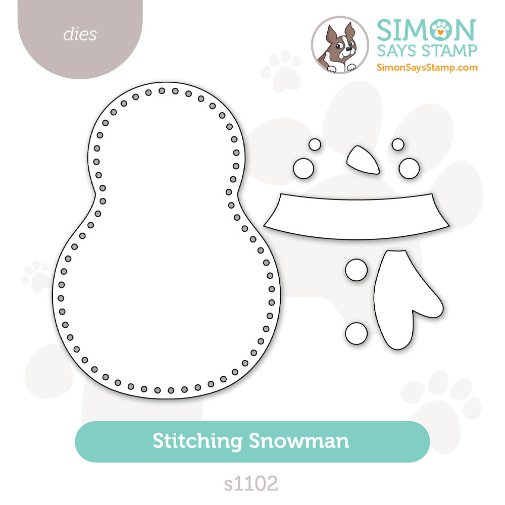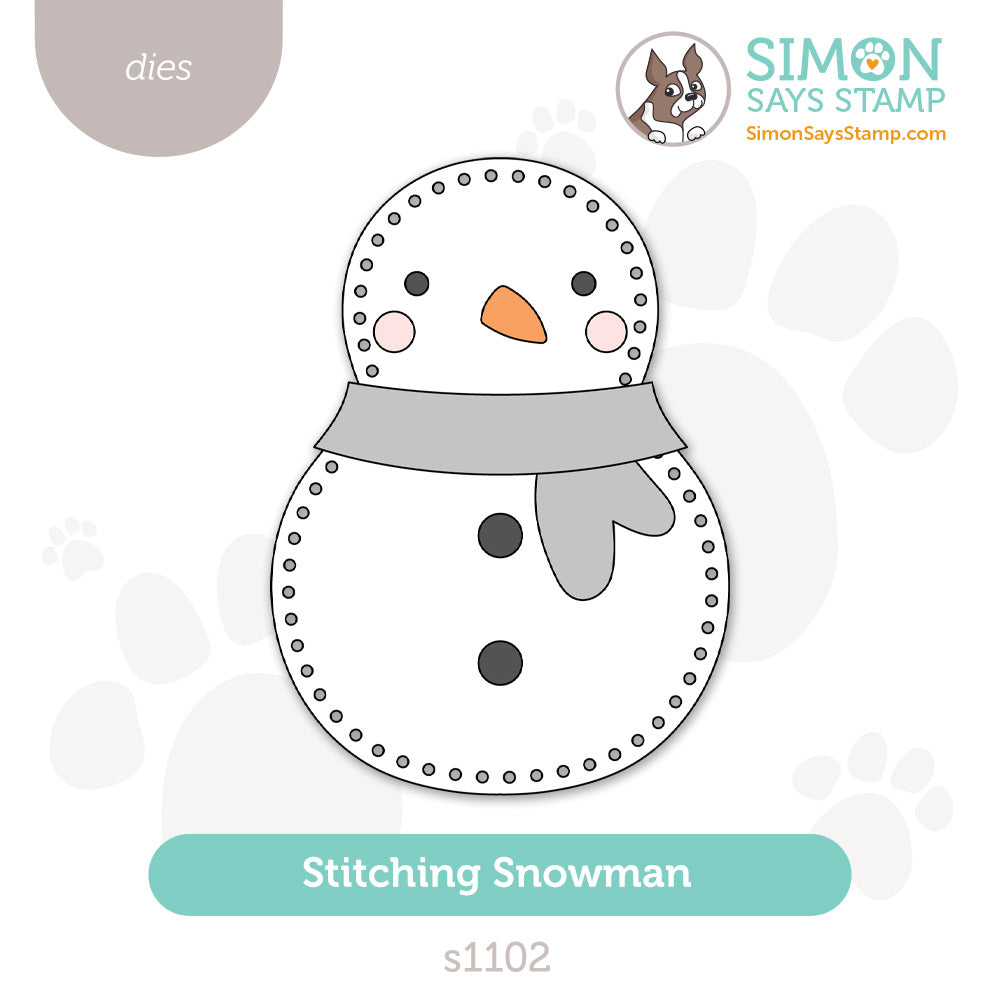 The Simon Says Stamp Stitching Snowman dies cut all the pieces you need to build a sweet snowman with rosy cheeks, a carrot nose, and a jaunty scarf. Stitching holes around the perimeter let you add homespun charm with thread, twine, or simple faux stitching.