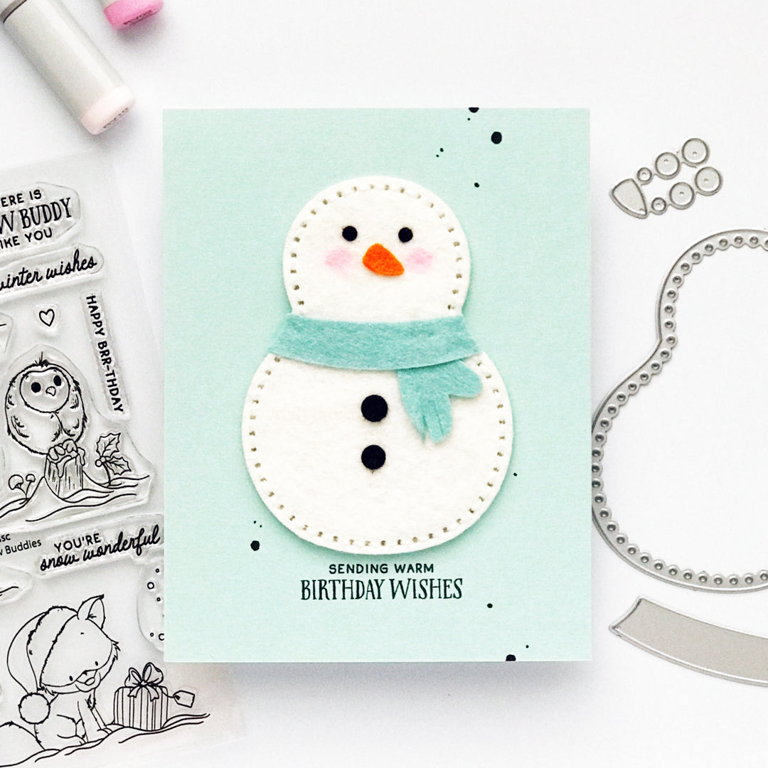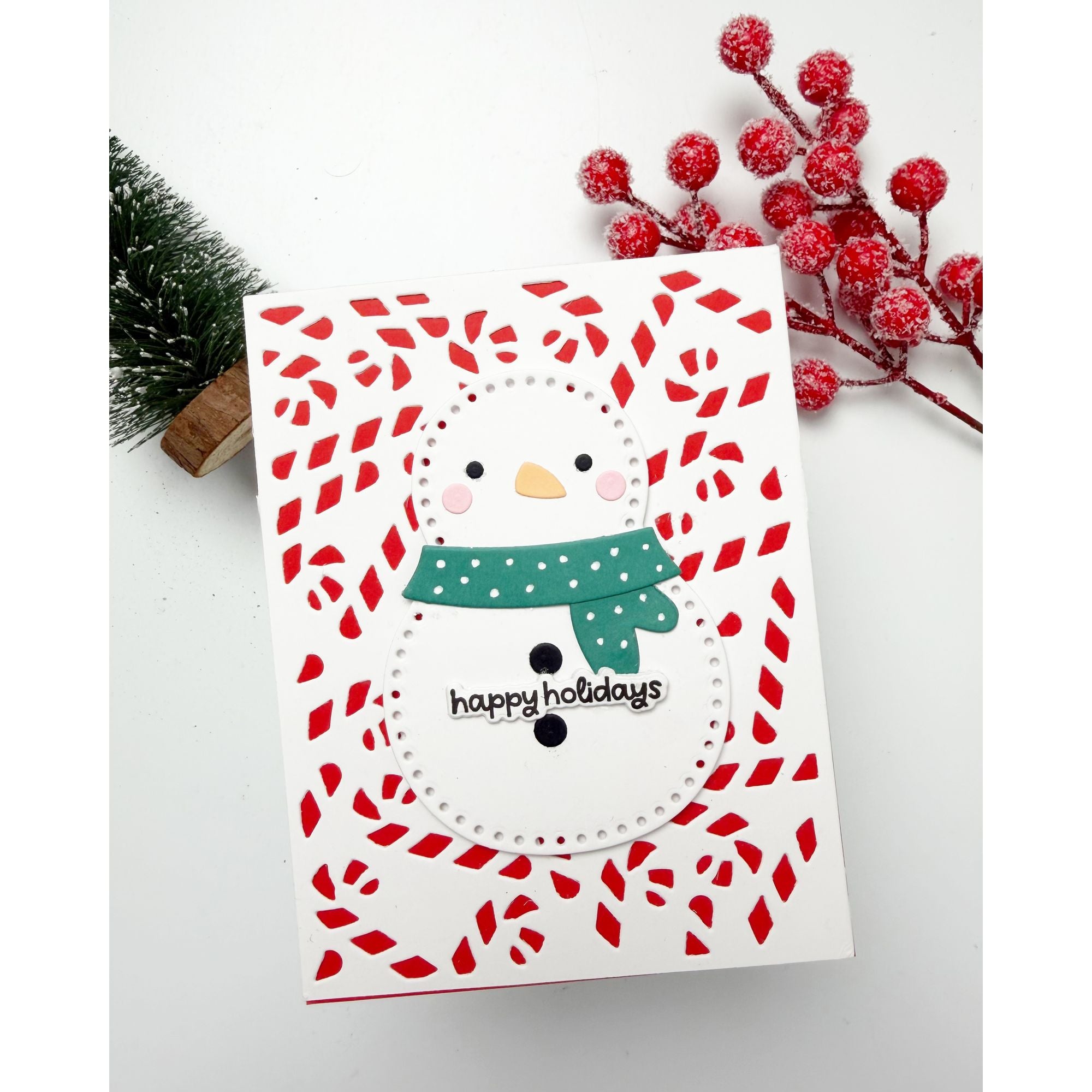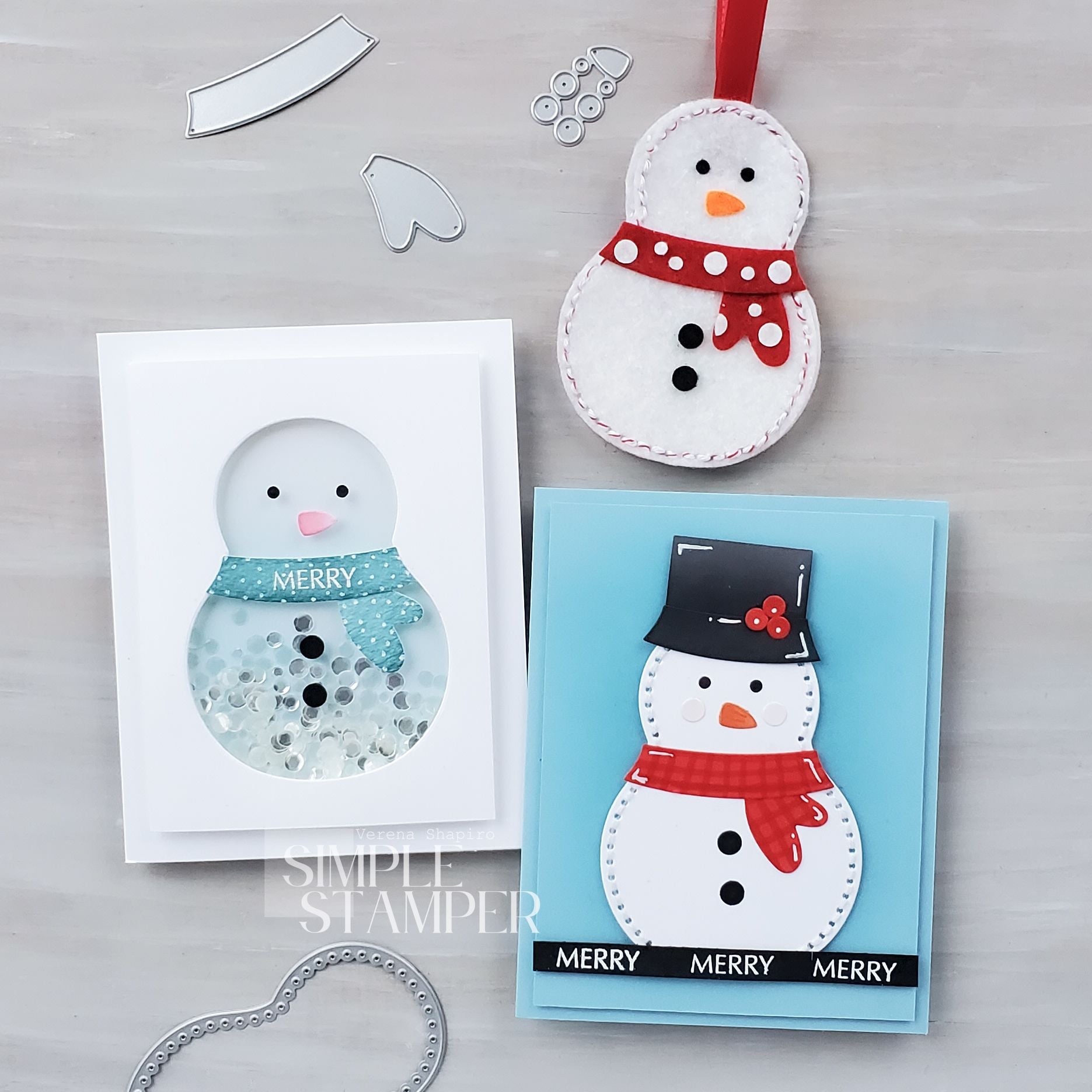 The Simon Says Stamp Stitching Snowman dies cut all the pieces you need to build a sweet snowman with rosy cheeks, a carrot nose, and a jaunty scarf. Stitching holes around the perimeter let you add homespun charm with thread, twine, or simple faux stitching.